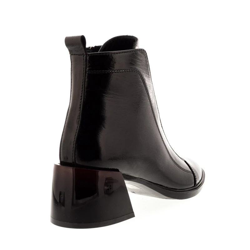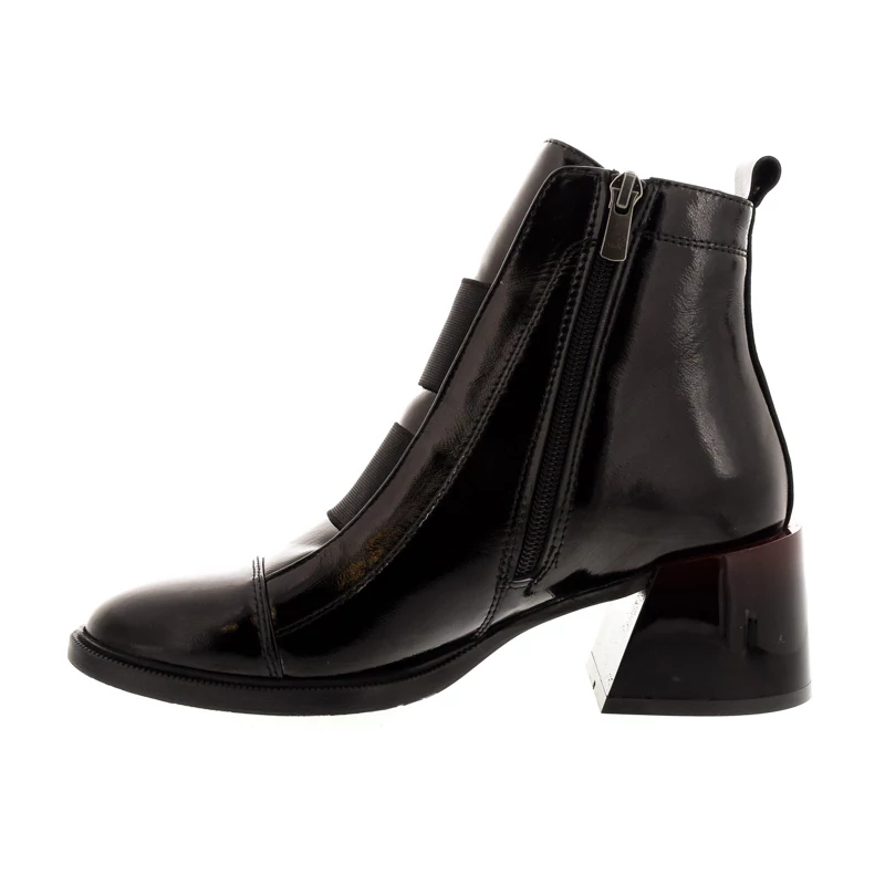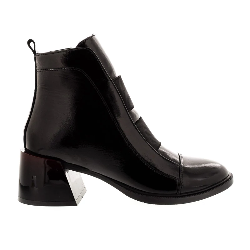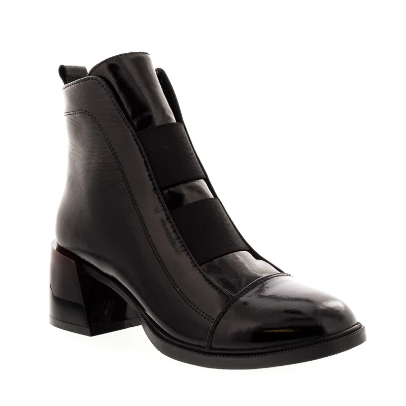 Ez a fűző nélküli bokacsizma elegáns és nőies választás a hétköznapokra és alkalmakra egyaránt. Fényes lakkbőr felsőrésze modern és letisztult megjelenést biztosít. A fűző helyét széles, rugalmas gumi pántok váltják fel, amelyek egyszerre kényelmesek és divatos részletként emelik ki a cipő stílusát. Különlegessége a 60 mm magas blokk sarok, amely színátmenetes, sötétbordó-fekete árnyalatban készült, fényes kivitelben. A stabil sarokkialakítás és az igényes részletek egyaránt a cipő nőies karakterét hangsúlyozzák. Sebastiano cipő webáruház Női cipő