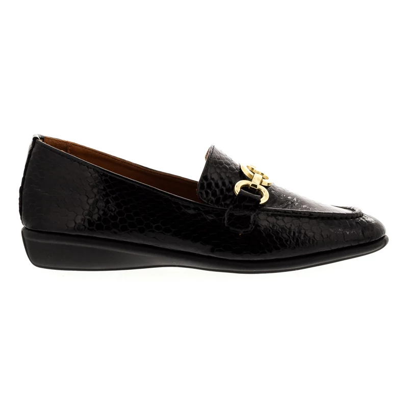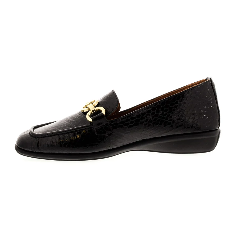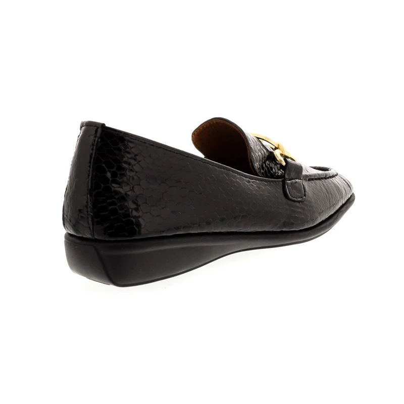 Ez az elegáns mokaszin a klasszikus stílust ötvözi a modern részletekkel. Fekete, fényes lakkbőr felsőrészét nyomott kígyóbőr minta teszi különlegessé, míg az arany színű csat díszítés kifinomult megjelenést kölcsönöz. Bőrbélése és puha talpbetétje kényelmes viseletet biztosít egész nap. Könnyű gumi talpa 25 mm-es sarokmagassággal stabilitást és tartósságot nyújt. Ideális választás elegáns hétköznapi szettekhez, amikor a kényelem mellett a stílus is fontos. Sebastiano cipő webáruház Női cipő