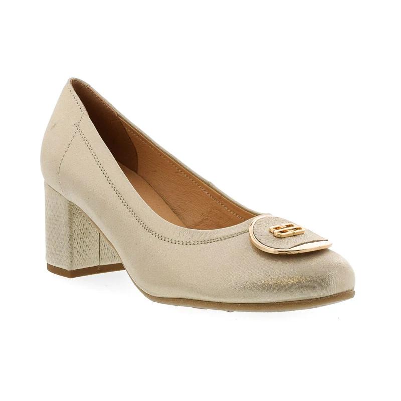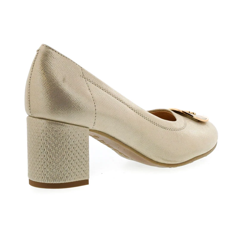 Elegáns női pumps, mely a klasszikus eleganciát és a modern megoldásokat ötvözve, kivételes kényelmet biztosít. A felsőrészén gyönyörű arany díszítés található, amely eleganciát kölcsönöz viselőjének. A kiváló minőségű anyagoknak és az innovatív Soft Step rendszernek köszönhetően ez a lábbeli tökéletes mindennapi viseletre és különleges alkalmakra egyaránt. Felsőrésze és bélése természetes bőrből készült, talpa gumi. A 6 cm magas tömb alakú sarok eleganciát és stabilitást ad a cipőnek járás közben. Sebastiano cipő webáruház Bioeco