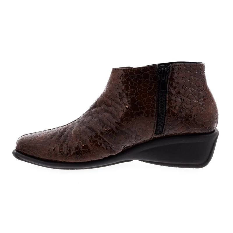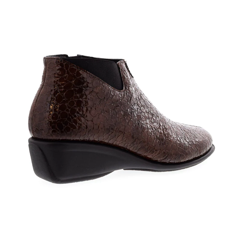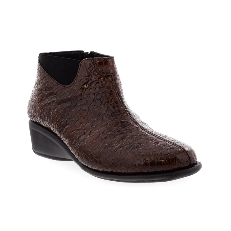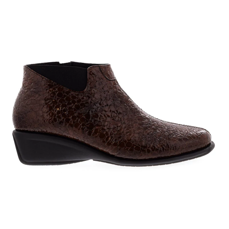Ez a DFC Relax bokacipő elegáns és kifinomult megjelenést kölcsönöz viselőjének. Felsőrésze kiváló minőségű nyomott mintás lakkbőrből készült. A puha anyagból kialakított természetes bőr talpbetét rendkívül jól alkalmazkodik a láb egyedi formájához, hozzájárul a kényelmes viselet érzetéhez. Talpa gumi, sarokmagassága 40 mm. Kényelmes sarokkialakításának köszönhetően kényelmes, ideális választás elegáns hétköznapokra. Sebastiano cipő webáruház Női cipő