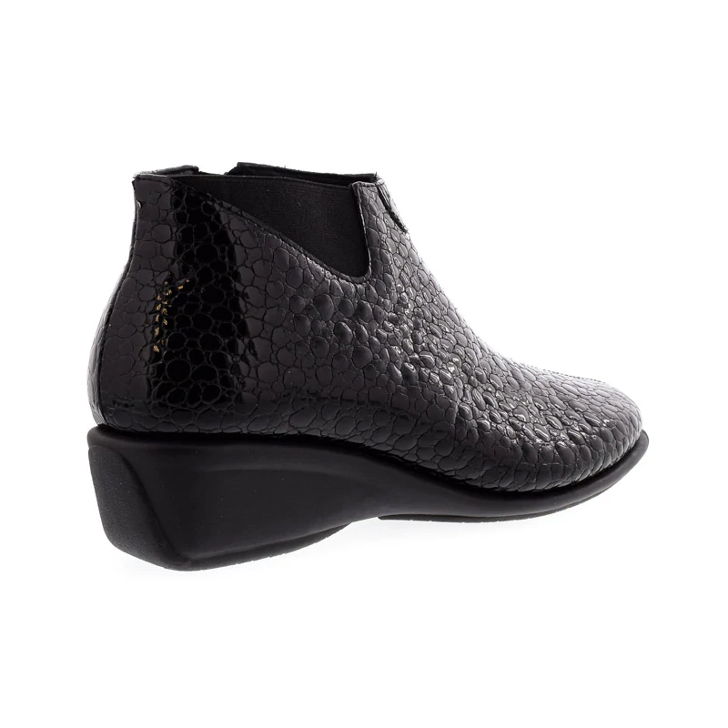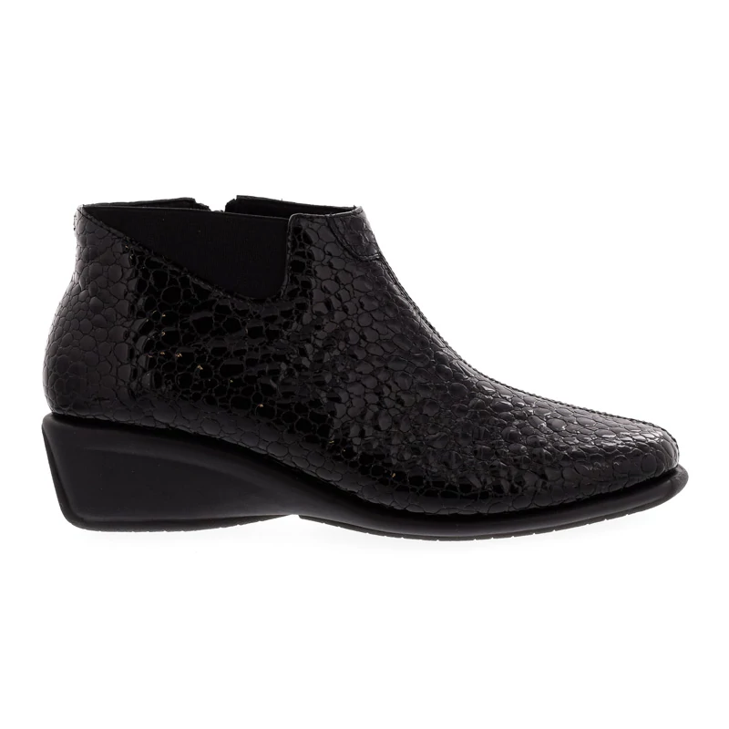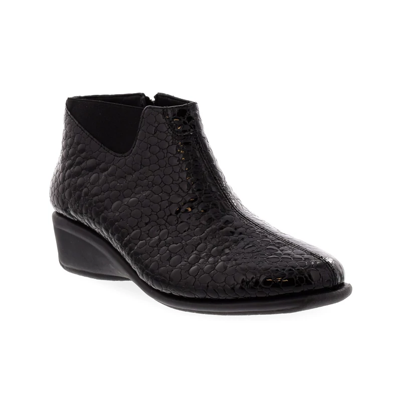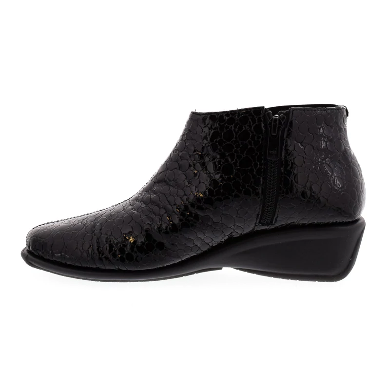 Ez a DFC Relax bokacipő elegáns és kifinomult megjelenést kölcsönöz viselőjének. Felsőrésze kiváló minőségű nyomott mintás lakkbőrből készült. A puha anyagból kialakított természetes bőr talpbetét rendkívül jól alkalmazkodik a láb egyedi formájához, hozzájárul a kényelmes viselet érzetéhez. Talpa gumi, sarokmagassága 40 mm. Kényelmes sarokkialakításának köszönhetően kényelmes, ideális választás elegáns hétköznapokra. Sebastiano cipő webáruház Női cipő