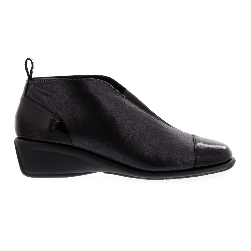 Ez a DFC Relax bokacipő kifinomult megjelenést kölcsönöz viselőjének. A felsőrész kíváló minőségű természetes bőr és lakkbőr kombinációja. A puha anyagból kialakított természetes bőr talpbetét rendkívül jól alkalmazkodik a láb egyedi formájához és hozzájárul a kényelmes viselet érzetéhez. Talpa gumi, sarokmagassága 40 mm. Sarokkialakításának köszönhetően kényelmes, ideális választás elegáns hétköznapokra. Sebastiano cipő webáruház Női cipő
