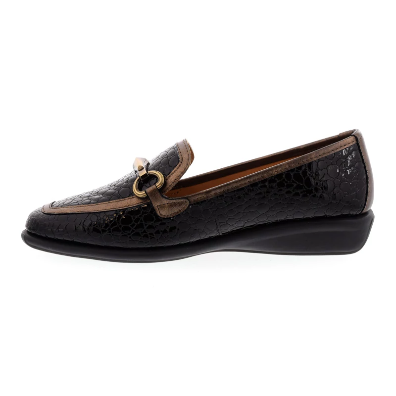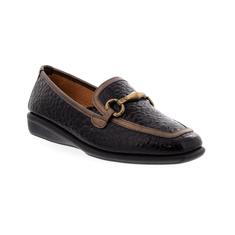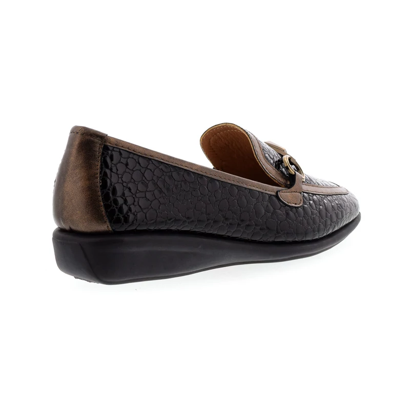 Ez a DFC Relax mokaszin elegáns és kifinomult megjelenést kölcsönöz viselőjének. Felsőrésze kíváló minőségű nyomott mintás lakkbőrből készült, ízléses arany színű díszítéssel. A puha anyagból kialakított természetes bőr talpbetét rendkívül jól alkalmazkodik a láb egyedi formájához, hozzájárul a kényelmes viselet érzetéhez. Talpa gumi, sarokmagassága 30 mm. Kényelmes sarokkialakításának köszönhetően ideális választás irodai viselethez vagy elegáns hétköznapokra. Sebastiano cipő webáruház Női cipő
