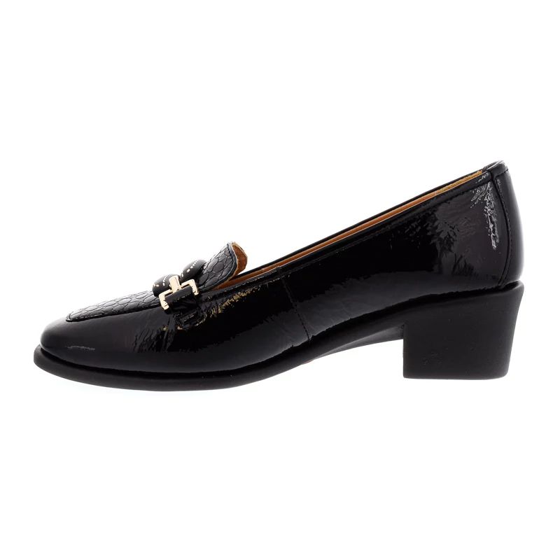Ez a DFC Relax mokaszin elegáns és kifinomult megjelenést kölcsönöz viselőjének. Felsőrésze kíváló minőségű nyomott mintás és sima lakkbőrből készült, ízléses arany színű díszítéssel. A puha anyagból kialakított természetes bőr talpbetét rendkívül jól alkalmazkodik a láb egyedi formájához, hozzájárul a kényelmes viselet érzetéhez. Talpa gumi, sarokmagassága 45 mm. Kényelmes sarokkialakításának köszönhetően ideális választás irodai viselethez vagy elegáns hétköznapokra. Sebastiano cipő webáruház Női cipő