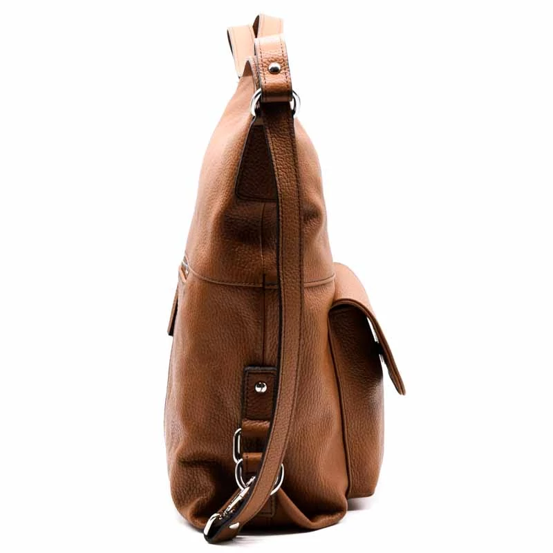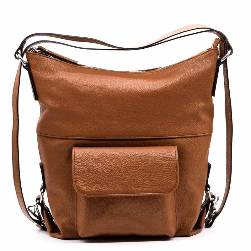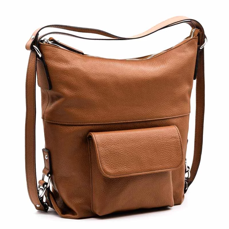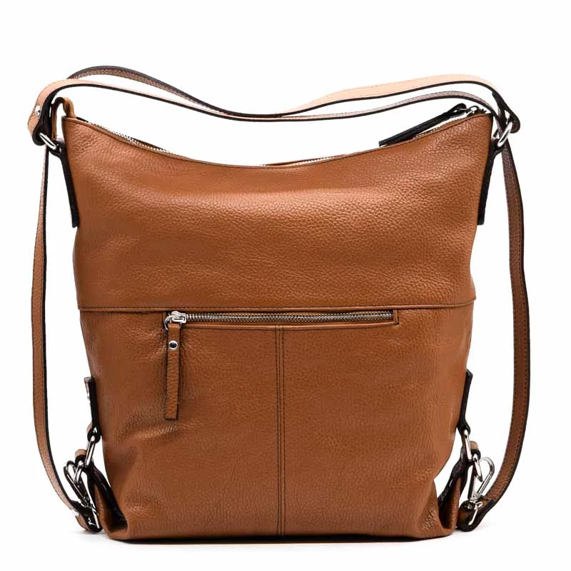 Olasz bőr válltáska, mely kialakításának köszönhetően hátizsákként is funkcionál. Belső kialakítása osztott terű, középen egy cipzáras fakkal. A belső részen két sima és egy zipzáras zseb található. A táska hátoldalán cipzáras zseb, elején egy patenttal záródó rekesz is helyet kapott. (Szélesség x magasság x mélység) 30x34x14cm Sebastiano cipő webáruház Táska