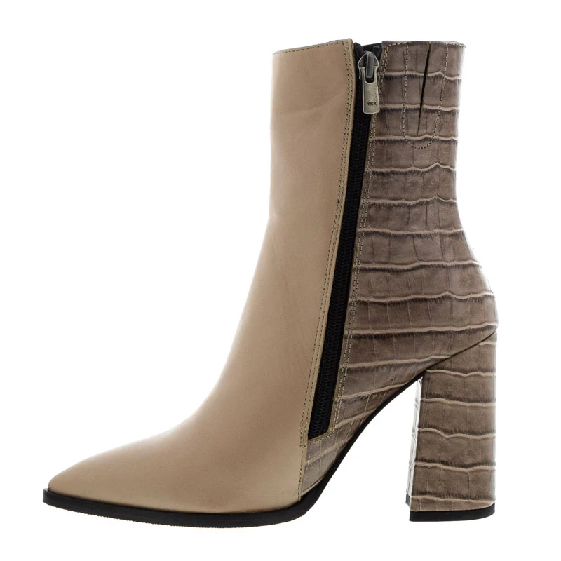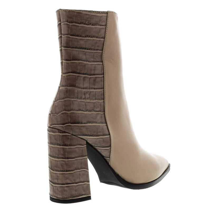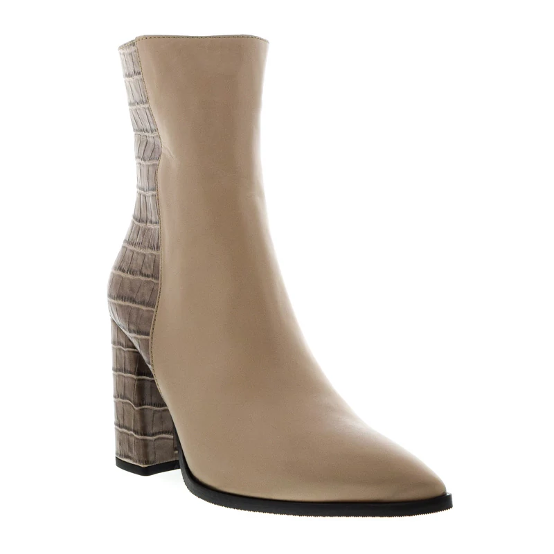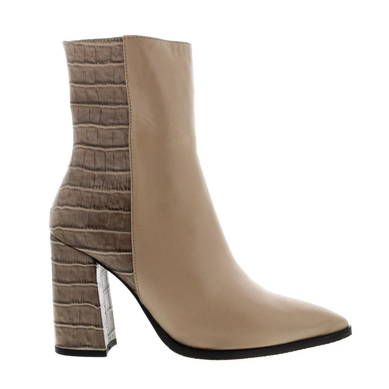 La Bellini elegáns, hegyes orrú, magassarkú bokacsizma természetes bőr felsőrésszel. Bélése textil, talpa gumi, sarokmagassága 95 mm. Vastag, krokó bőrrel bevont sarokkal készült. A cipő hátsó része krokó mintás természetes bőr, amely különleges, exkluzív megjelenést kölcsönöz a modellnek. Sebastiano cipő webáruház Női cipő