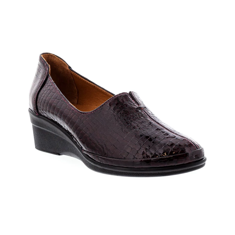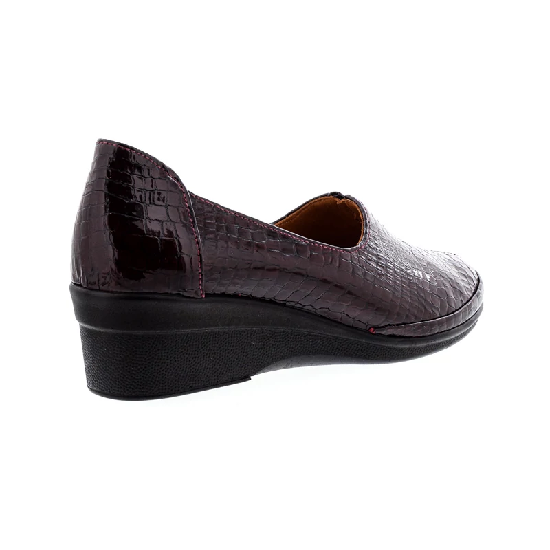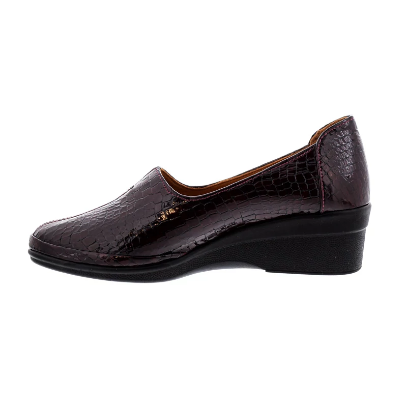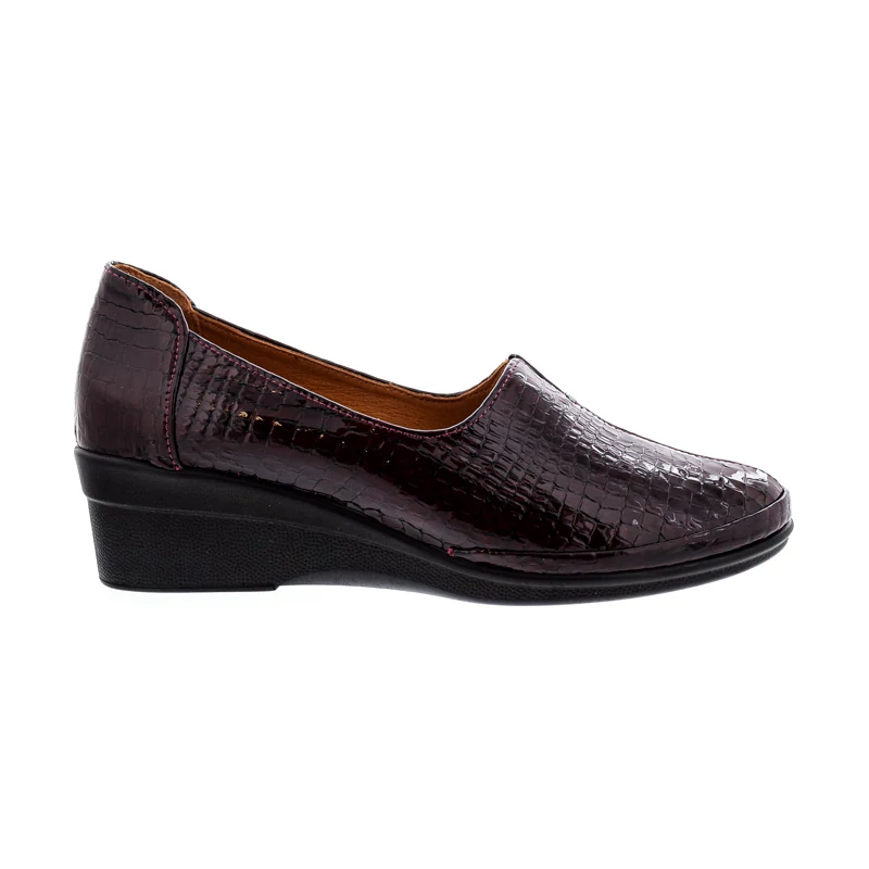Ez a női bebújós félcipő a kényelem és az elegancia tökéletes kombinációja. A fényes, krokó mintázatú bordó felsőrész különleges megjelenést biztosít. Felsőrésze nyomott mintás lakkbőrből készült, bélése természetes bőr, talpa gumi. Sarokmagassága 48 mm. Az éktalp kialakítása kényelmet és stabiltást kölcsönöz viselőjének, így tökéletes választás a mindennapokra. Sebastiano cipő webáruház Női cipő