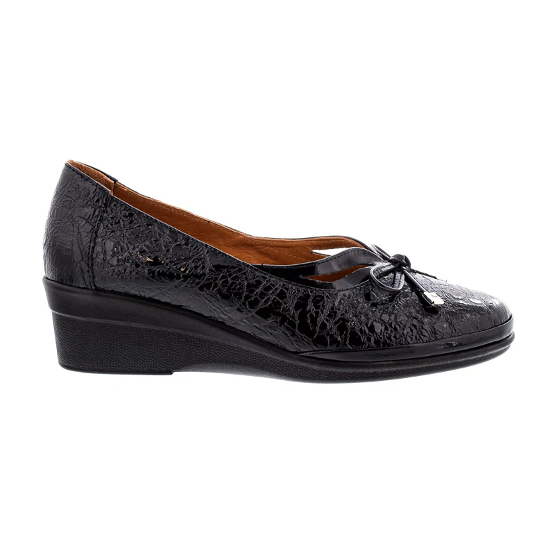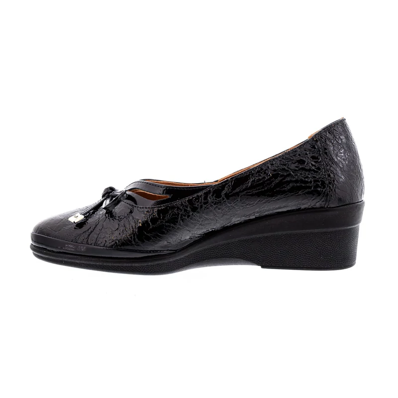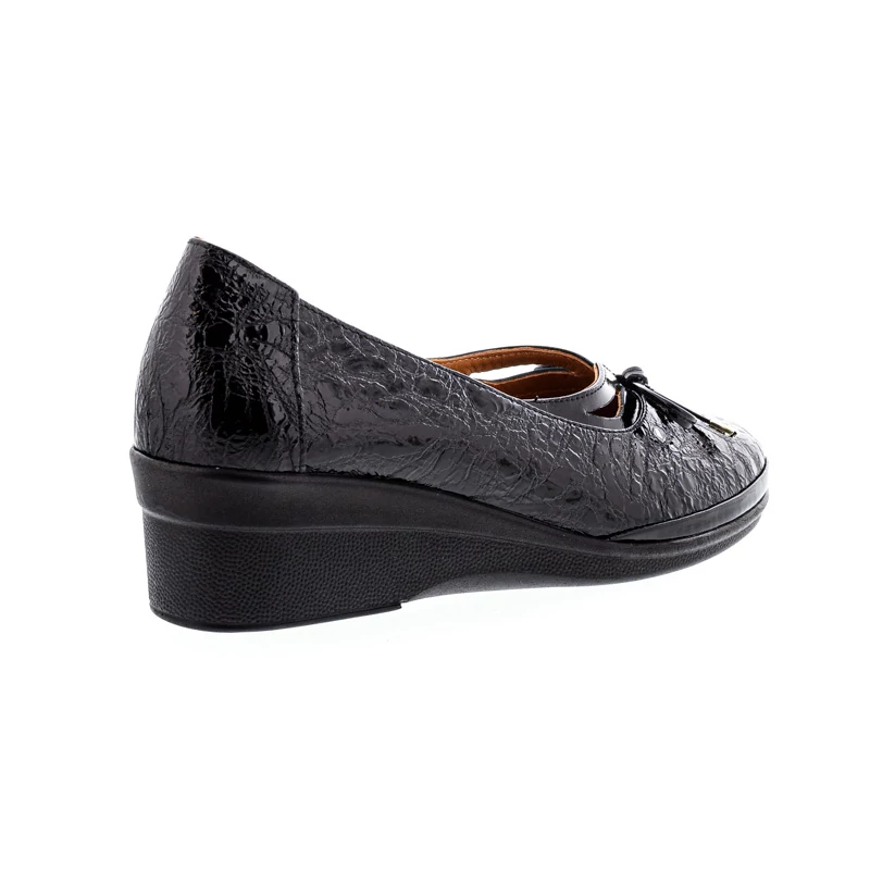 Ez a női félcipő a kényelem és az elegancia tökéletes kombinációja. A fényes, nyomott mintázatú fekete felsőrész különleges megjelenést biztosít, míg a masnis díszítés nőies és finom részletet kölcsönöz. Felsőrésze lakkbőrből készült, bélése természetes bőr, talpa gumi. Sarokmagassága 48 mm. Sarokkialakítása stabilitást és kényelmes viseletet biztosít, így tökéletes választás a mindennapokra. A puha anyagból kialakított természetes bőr talpbetét rendkívül jól alkalmazkodik a láb egyedi formájához. Sebastiano cipő webáruház Női cipő