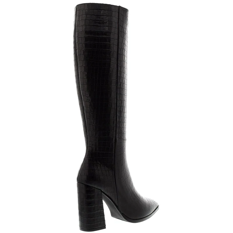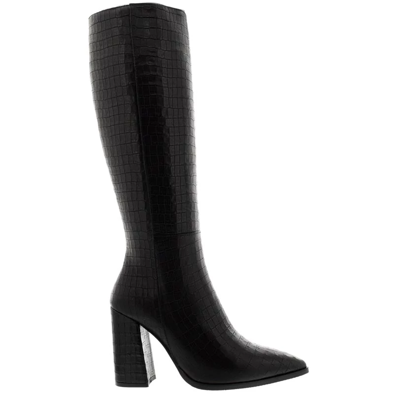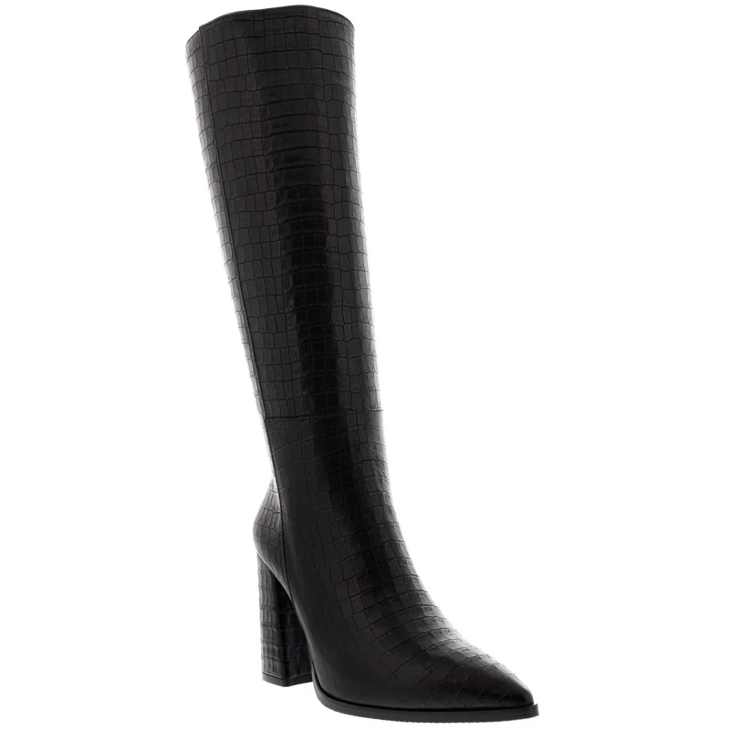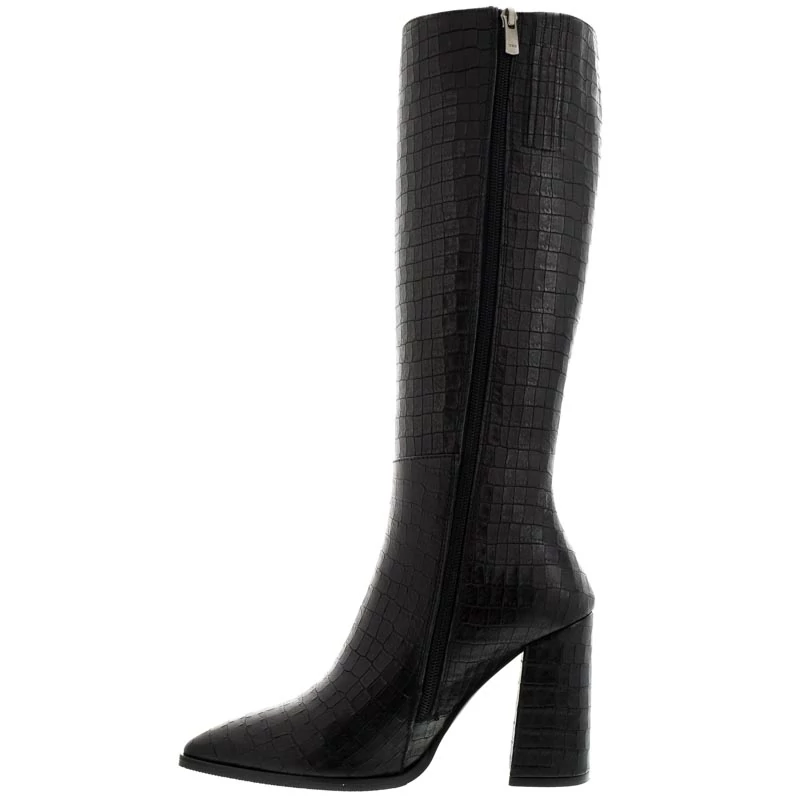 La Bellini elegáns, hegyes orrú, magassarkú hosszú szárú csizma, krokó mintás természetes bőr felsőrésszel. Bélése textil, talpa gumi, sarokmagassága 95 mm. A vastag, bőrrel bevont sarok stabil tartást és kifinomult megjelenést biztosít. Sebastiano cipő webáruház Női cipő