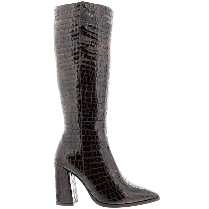 La Bellini elegáns, hegyes orrú, magassarkú hosszú szárú csizma, krokó mintás lakkbőr felsőrésszel. Bélése textil, talpa gumi, sarokmagassága 95 mm. A vastag, bőrrel bevont sarok stabil tartást és kifinomult megjelenést biztosít. Sebastiano cipő webáruház Női cipő