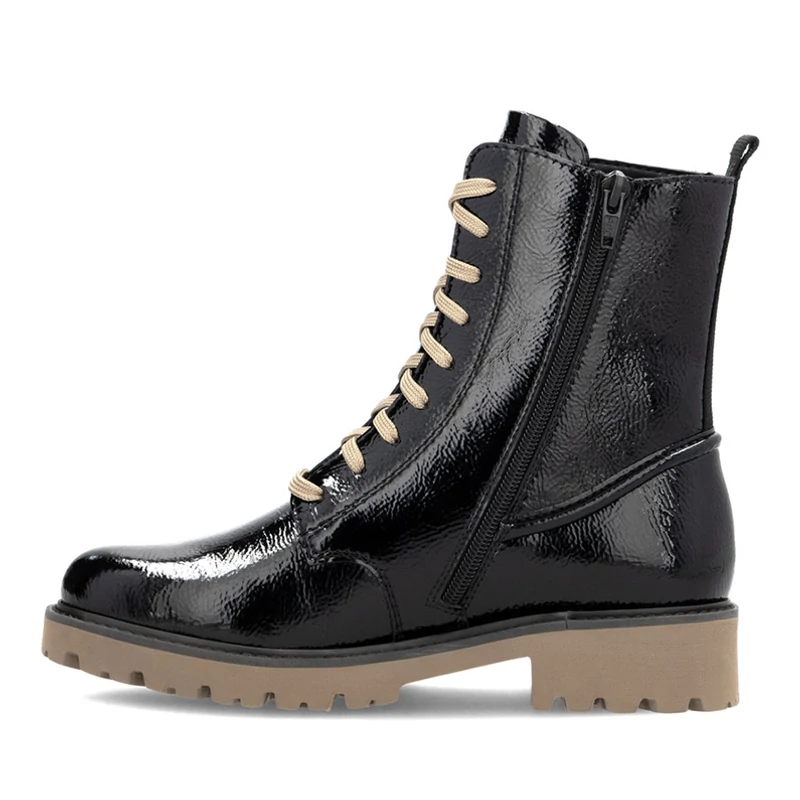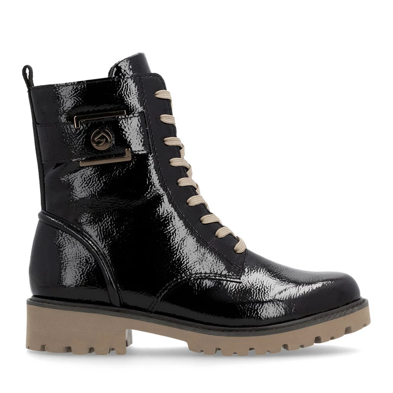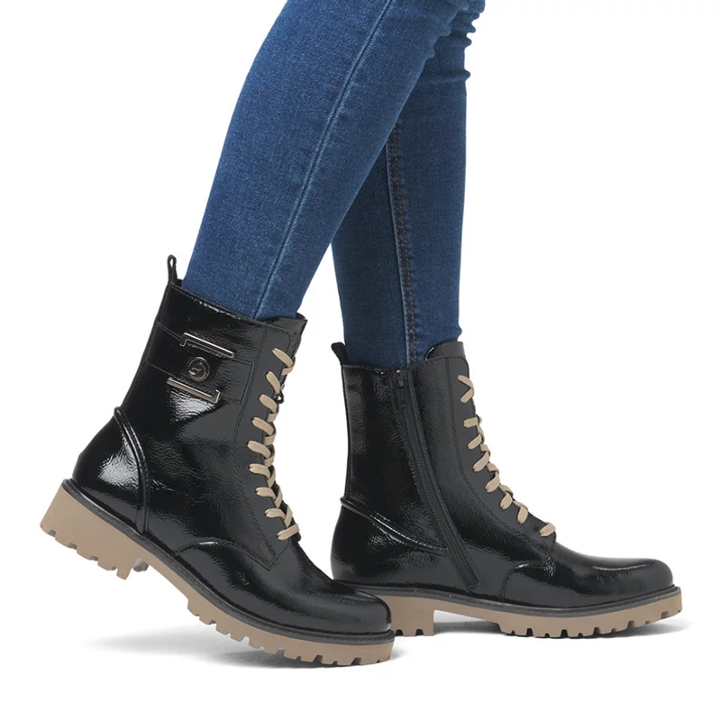 A REMONTE lábbeli a RIEKER márka magasabb kínálata, a lábbeliket a felhasznált anyagok minősége jellemzi. A magas csillogás és a stílus jellemző ezekre a bokacsizmákra, a fekete fényes felsőrésszel és a bokánál díszítő elemmel kihagyhatatlan. Praktikus cipzár a belső oldalon és fűzés biztosítja a könnyű felhelyezést és a határozott illeszkedést. A markáns mintázatú magasabb talpnak köszönhetően stabil járást fog élvezni. A kivehető talpbetét maximális kényelmet biztosít és megkönnyíti a karbantartást. Sebastiano cipő webáruház Rieker lábbeli
