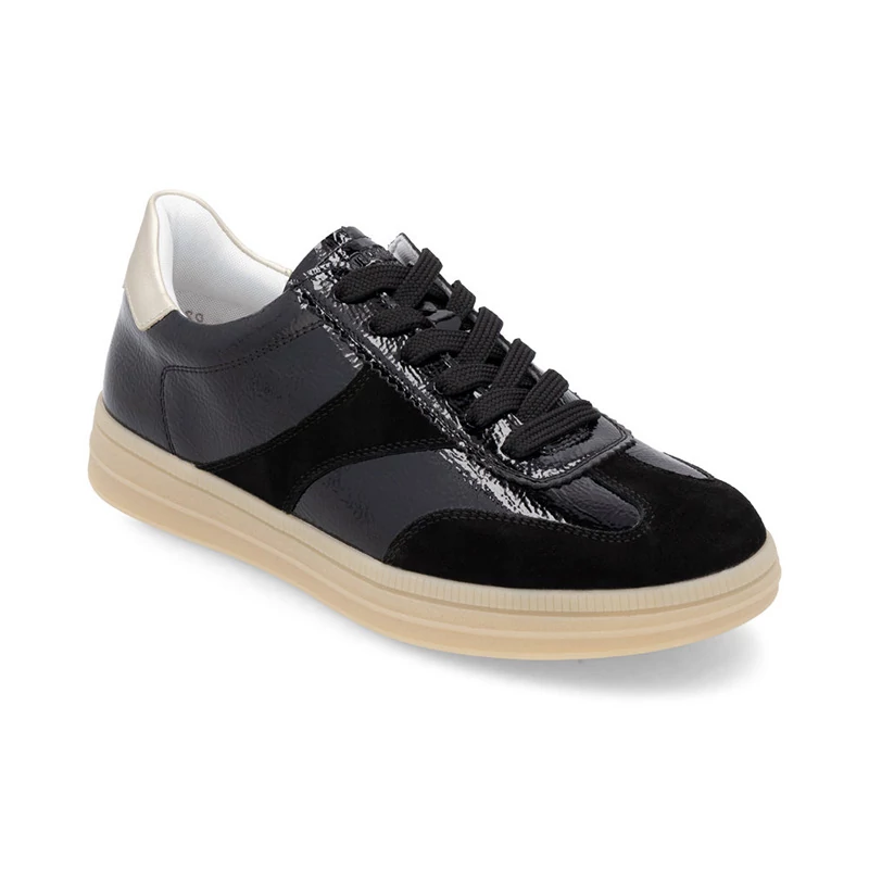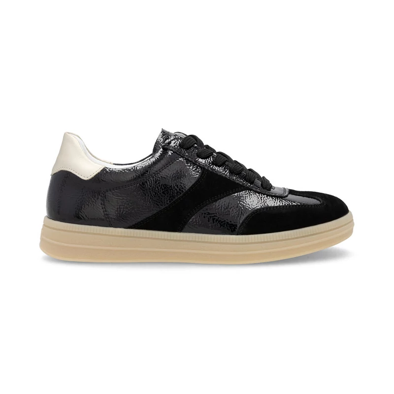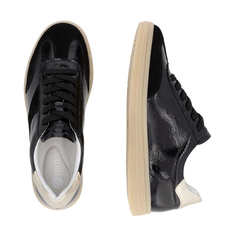 REMONTE cipő - ez a RIEKER márka magasabb vonala, ezt a cipőt a felső anyagok kiváló kombinációja jellemzi. Ezek a tornacipők lenyűgöznek gyönyörű dizájnjukkal, ahol a fekete bőr felsőrész a matt és fényes vonalakat ötvözi a modern megjelenés érdekében, míg a sarok fémes eleme stílusos akcentust kölcsönöz. A fűzés tökéletes illeszkedést tesz lehetővé, míg az öntött puha talpbetét minden lépésnél maximális kényelmet biztosít. A színkontrasztos talp nemcsak vizuális érdeklődést kölcsönöz, hanem stabilitást és kényelmet is biztosít viselése közben. Sebastiano cipő webáruház Női cipő