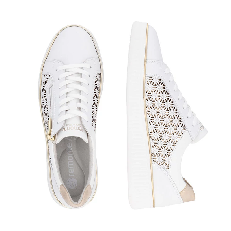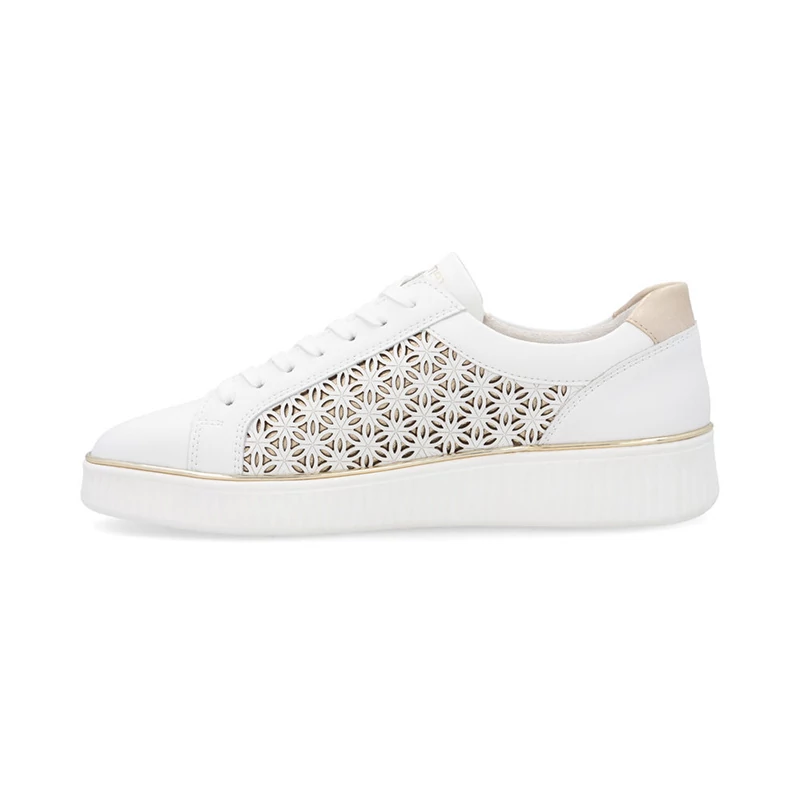 REMONTE cipő - ez a RIEKER márka magasabb vonala, ezt a cipőt a felső anyagok kiváló kombinációja jellemzi. Ezek a fehér tornacipők lenyűgöznek egyedi perforációjukkal, amelyet stílusosan egészítenek ki arany árnyalatok, amelyek finom fényt adnak, a sarok fémes részlete pedig kiemeli vonzó dizájnjukat. A lábfej cipzára megkönnyíti a felhelyezést, a fűzés pedig lehetővé teszi a cipők beállítását a tökéletes kényelem érdekében. A kivehető puha talpbetét minden lépésnél kényelmet biztosít, a kontrasztos fehér talp pedig modern megjelenést és megbízható stabilitást kölcsönöz a tornacipőknek. Sebastiano cipő webáruház Női cipő