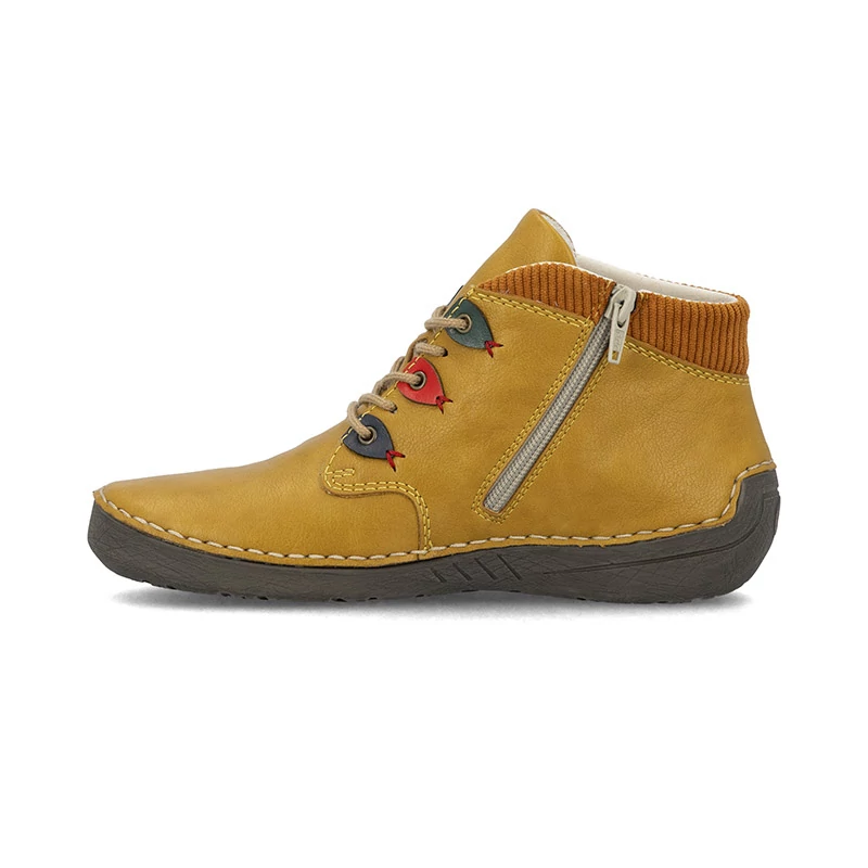 Ez az eredeti RIEKER cipőmodell első pillantásra magára vonzza a tekintetet jellegzetes sárga színével és színes részleteivel, amelyek egyedi karaktert kölcsönöznek a cipőnek. A praktikus fűzőrendszer oldalsó cipzárral lehetővé teszi a könnyű felvételt és a tökéletes lábhoz igazítást. A puha textil talpbetét egész napos viselés közben is kényelmet biztosít, míg a rugalmas talp ütéscsillapító technológiával garantálja a kényelmes lépést bármilyen felületen. Ideális választás azoknak a nőknek, akik ki szeretnének tűnni, és ugyanakkor élvezni szeretnék a kényelmet. Sebastiano cipő webáruház Rieker lábbeli