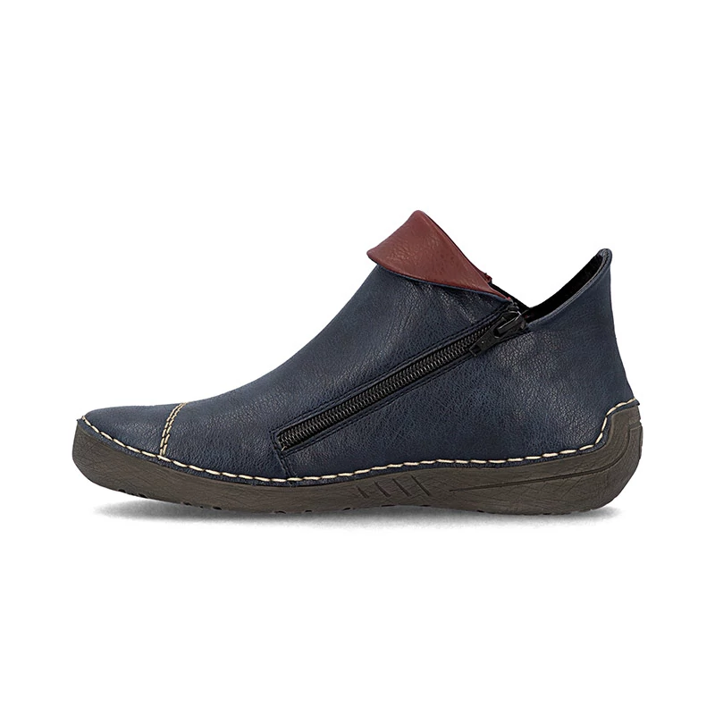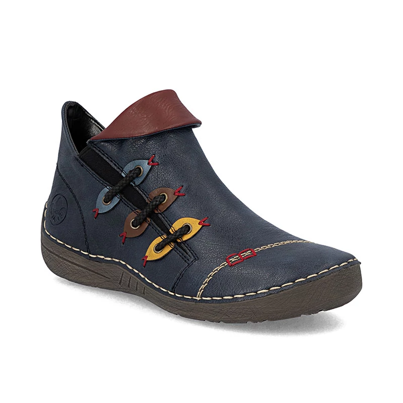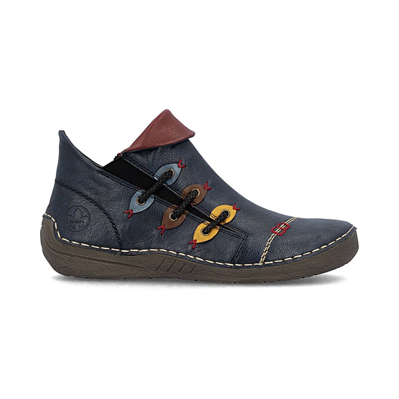 A RIEKER márka ezen egyedi modellje garantáltan magára vonzza a figyelmet játékos dizájnjával és színes részleteivel. A kék felsőrészt kontrasztos varrások és a lábfej belső részén található díszes foltok teszik teljessé, amelyek teljessé teszik az eredeti megjelenést. Az oldalsó rugalmas szalagok nemcsak a könnyebb felvevést teszik lehetővé, hanem a kényelmes illeszkedést is biztosítják. A márkára jellemző a felsőrészt a talppal összekötő jellegzetes varrás, amely eredeti karaktert kölcsönöz a cipőnek. Ez a modell ideális választás mindazok számára, akik ki szeretnének tűnni a tömegből, és ugyanakkor élvezni szeretnék a mindennapi kényelmet. Sebastiano cipő webáruház Rieker lábbeli