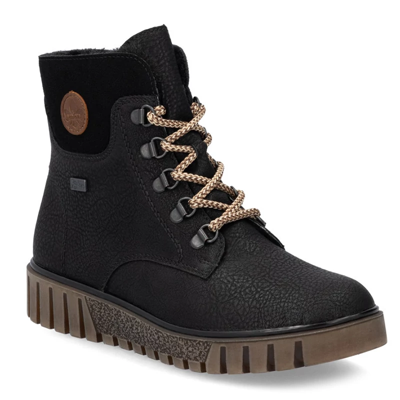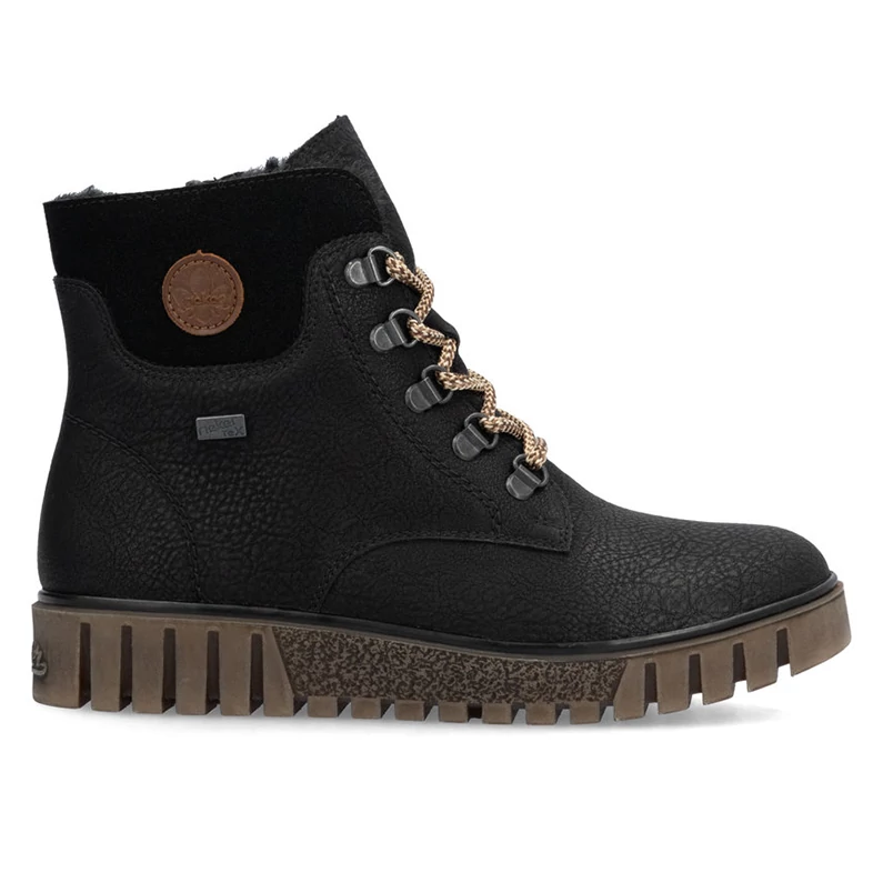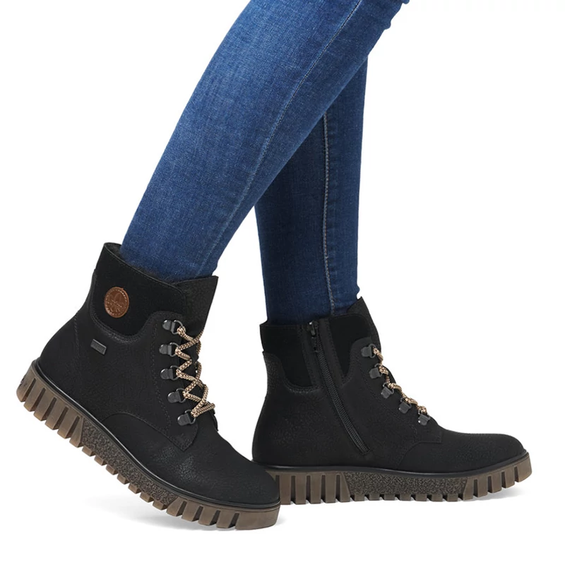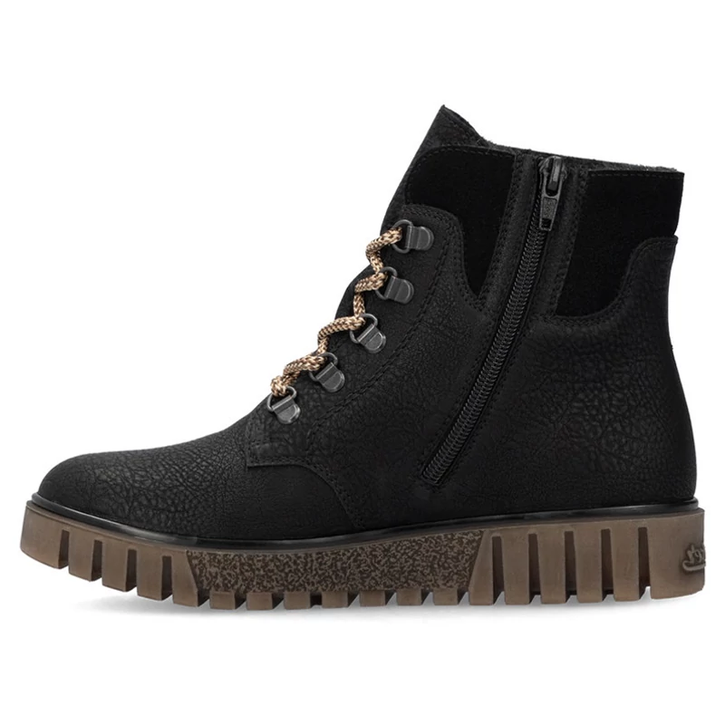 Ez a Rieker női bokacsizma fekete felsővel, finom varrással, logóval és fém csipkefülekkel díszített. Az egyedülálló funkcionális réteg vízállóságot, ugyanakkor légáteresztőt biztosít. A belső cipzár és a fűzés megkönnyíti a cipő felvitelét, mellyel könnyedén, közvetlenül a lábfejedhez igazíthatod a cipőt. Valódi báránygyapjúból készült puha talpbetétnek és bélésnek köszönhetően minden lépésnél kényelemben lesz része, amely fagyos időben is felmelegíti a lábát. A maximális kényelem érdekében a talp Antistress technológiával van felszerelve az ütéselnyelés és a rugalmasság érdekében, nincs olyan hely vagy helyzet, ahol ezek a cipők cserbenhagynának. Sebastiano cipő webáruház Rieker lábbeli