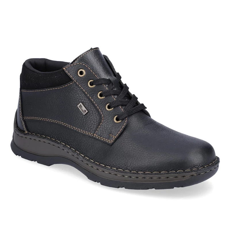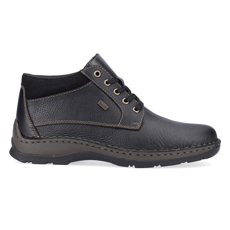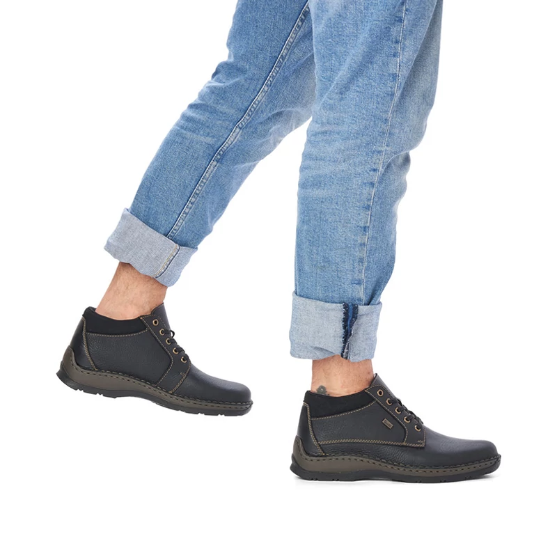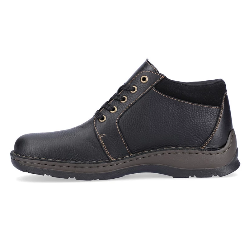 A finom szerkezetű fekete felsőrész kontrasztos varrással és a lábfejen fűzővel díszített, hogy könnyebben felvehető legyen. A meleg érzet érdekében a talpbetét és a bélés valódi báránygyapjúból készült, így ez a bokacipő a megfelelő választás lesz a hideg napokra. A körülbelül 3 cm magas, kemény talp könnyű és rugalmas az Antistress technológiának köszönhetően. Sebastiano cipő webáruház Rieker lábbeli
