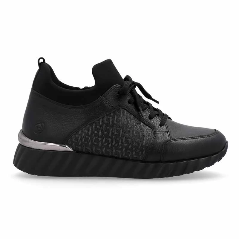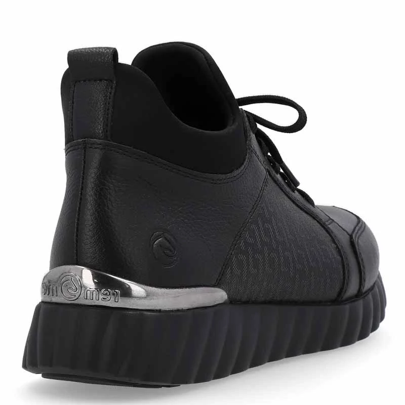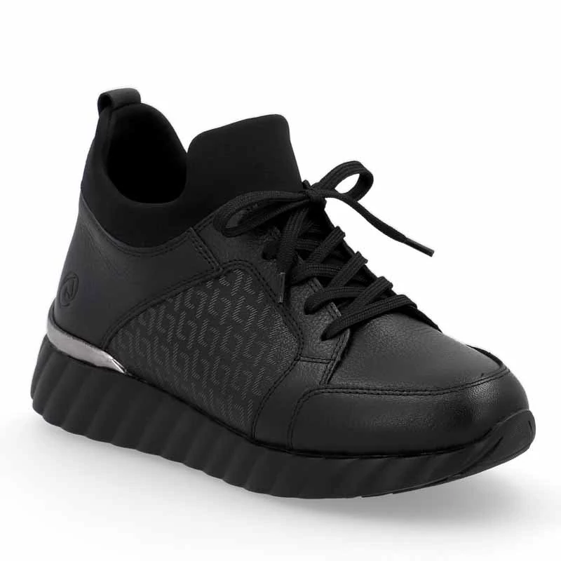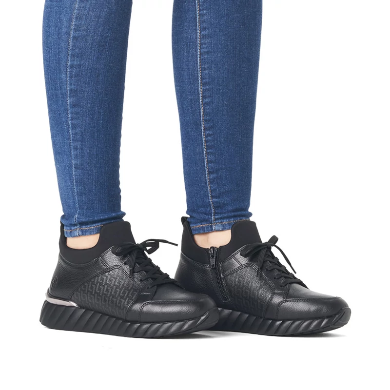 A sima felsőrész finom nyomattal, varrással, nyomott márkalogóval, de a felső szélén textilszegéllyel is díszített. A cipő a cipzárnak köszönhetően könnyen felvehető, és a fűzővel állítható, illetve ennek a modellnek az előnye a kivehető memory betét vagy a könnyű talp is. Sebastiano cipő webáruház Rieker lábbeli