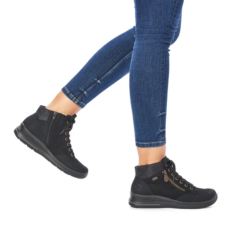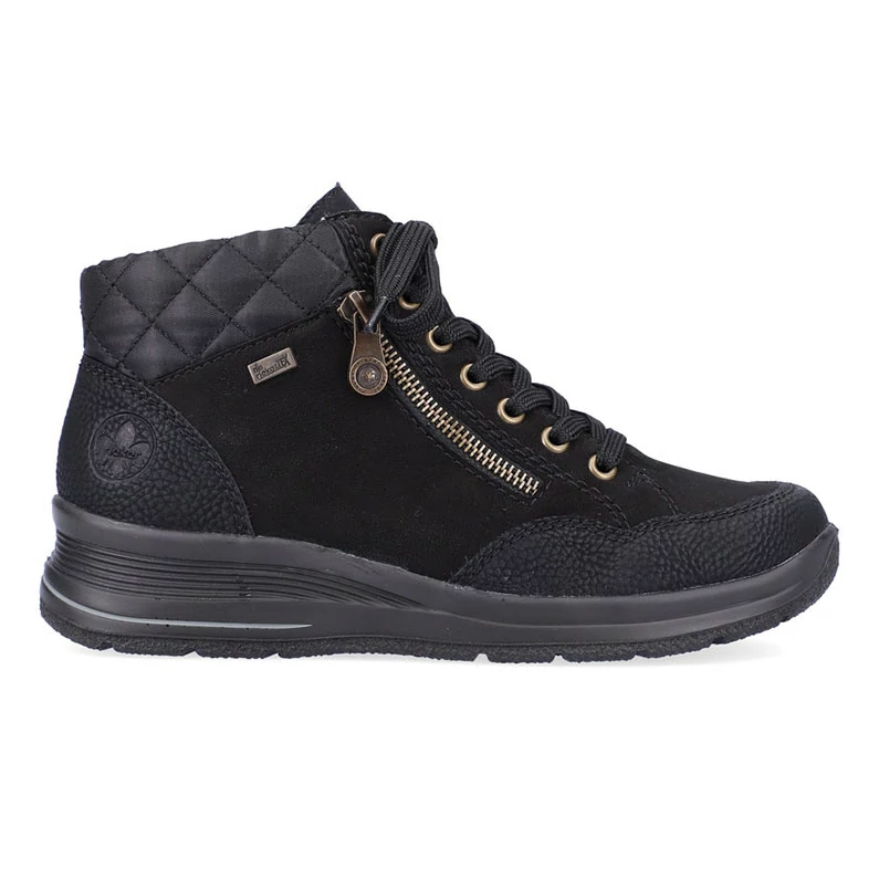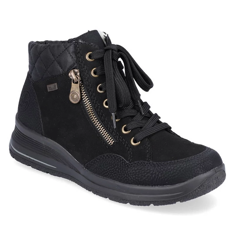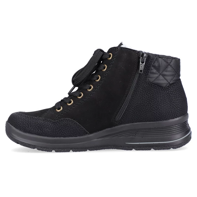 Enyhén éktalpú modell, mellyel akár az egész napos viselés is kényelmes.Felsőrésze természetes bőr, bélése filc.30mm-es sarokmagasságú fűzős bokacipő. Sebastiano cipő webáruház Rieker lábbeli