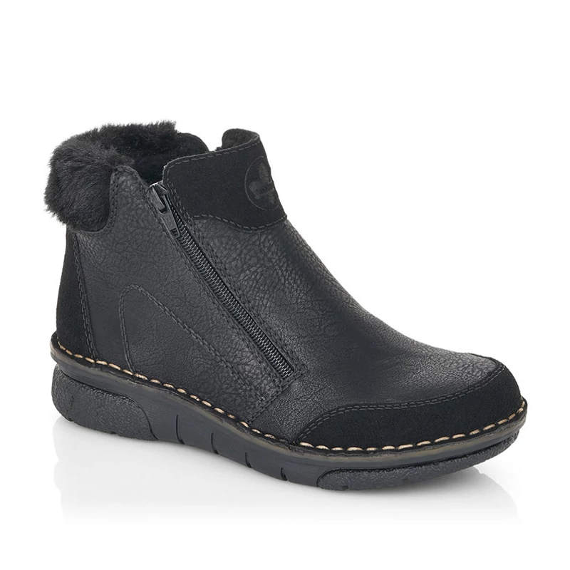 A finom szerkezetű felsőrészt szálcsiszolt anyag egészíti ki az orrnál, a saroknál és a lábfejnél, díszítőelemei pedig a varrások és a cipő hátulján puha szőrzet. Kívül és belül egyaránt funkcionális cipzárok szolgálják a cipő könnyű felhúzását, a komfortérzetről pedig a puha talpbetét és a meleg szőrme bélése gondoskodik. Sebastiano cipő webáruház Rieker lábbeli