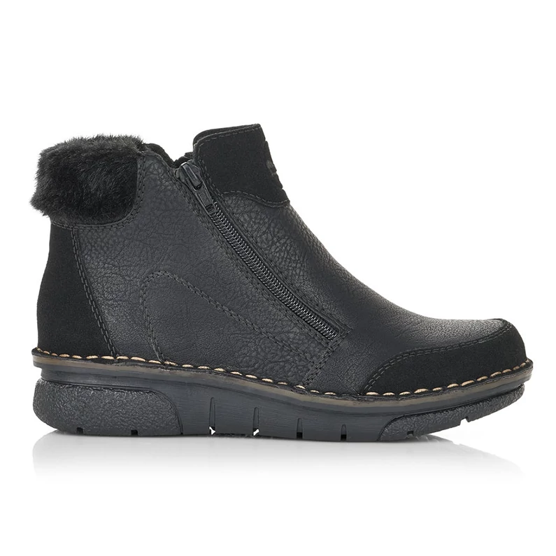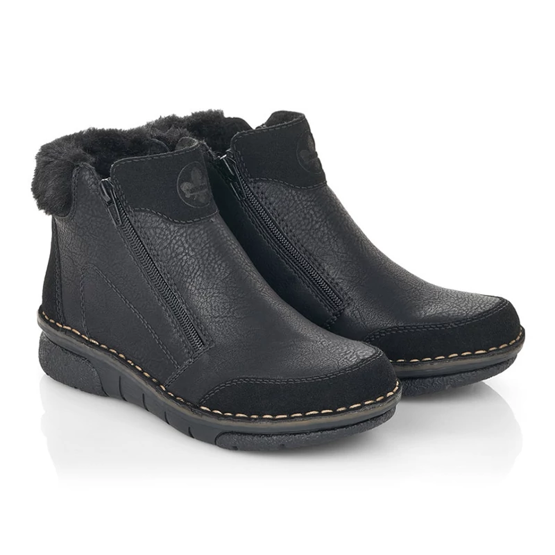 A finom szerkezetű felsőrészt szálcsiszolt anyag egészíti ki az orrnál, a saroknál és a lábfejnél, díszítőelemei pedig a varrások és a cipő hátulján puha szőrzet. Kívül és belül egyaránt funkcionális cipzárok szolgálják a cipő könnyű felhúzását, a komfortérzetről pedig a puha talpbetét és a meleg szőrme bélése gondoskodik. Sebastiano cipő webáruház Rieker lábbeli