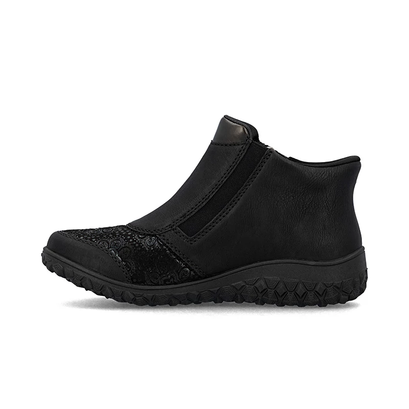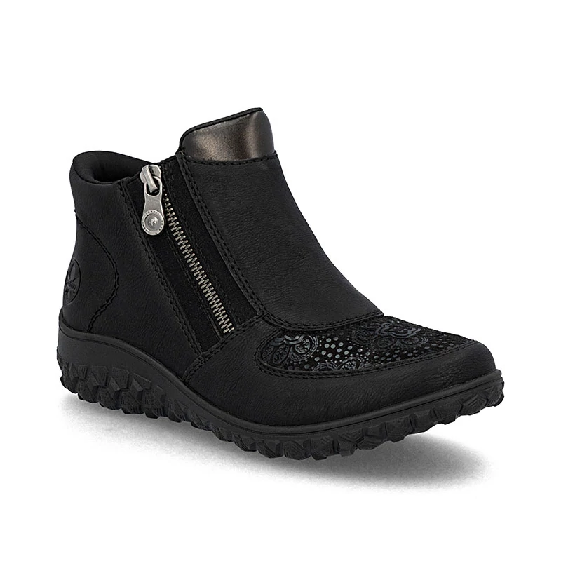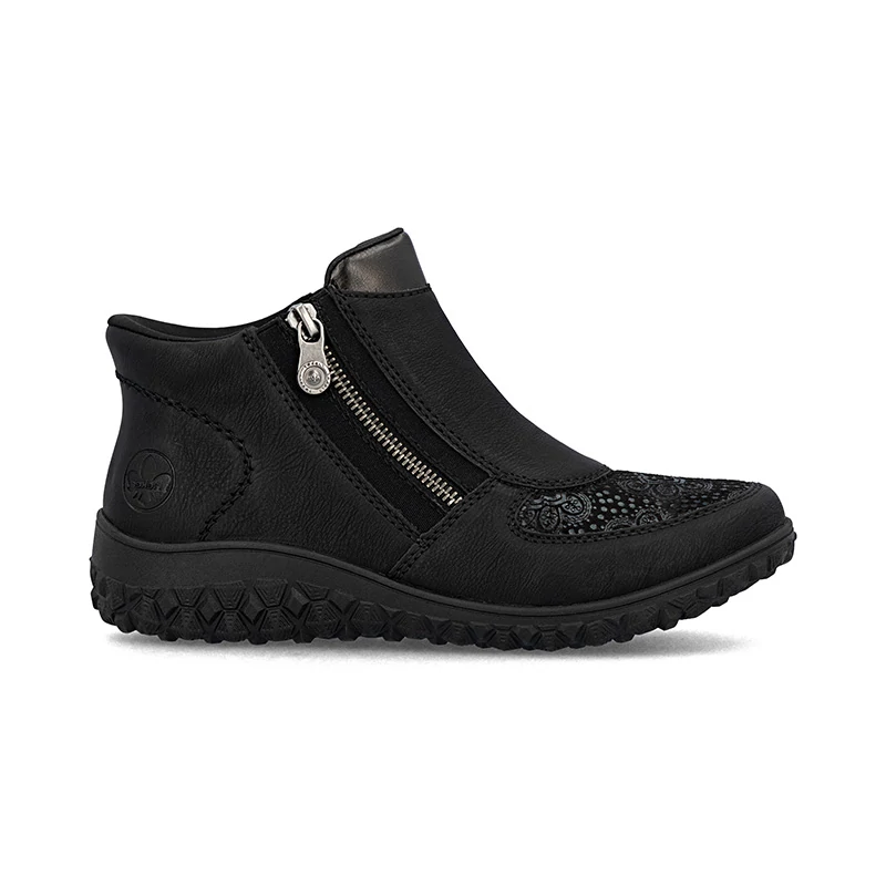 Ezek a RIEKER bokacsizmák modern megjelenésükkel és praktikus részleteikkel fognak lenyűgözni. A fekete anyagok kombinációját az elülső részen található eredeti motívum és a lábfej belsejében található fényes elem egészíti ki, ami diszkrét dizájnban lenyűgöző megjelenést kölcsönöz. A cipő belső részén található rugalmas textil rész és a külső részén található cipzár megkönnyíti a felvételt, a sarok pedig megerősített a könnyebb kezelhetőség érdekében. Felvételkor élvezni fogod az ergonomikusan formázott, kivehető talpbetét puhaságát, amely minden lépésnél kényelmet biztosít. A stílusos kialakítású, ütéscsillapítással ellátott, magasabb talp magabiztosságot ad járás közben, a szélesebb szabás pedig elegendő helyet biztosít még az igényesebb lábak számára is. Sebastiano cipő webáruház Rieker lábbeli
