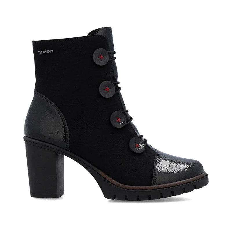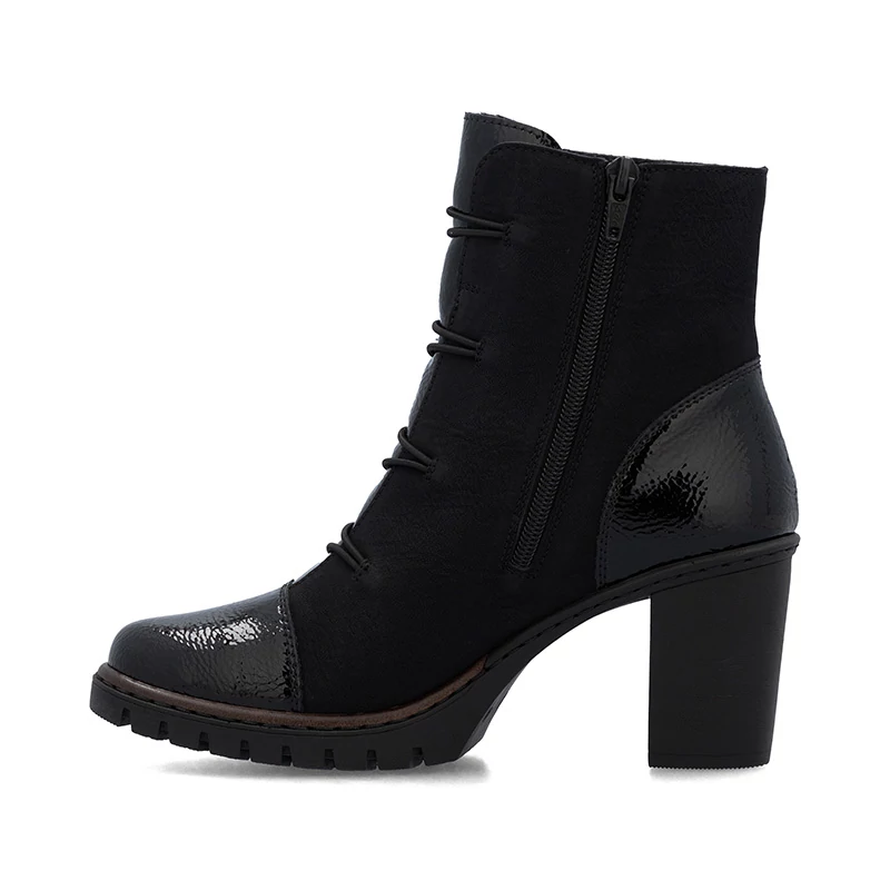 Kihagyhatatlan RIEKER bokacsizma modell, amely eredeti anyagkombinációjával és a felsőrész hatékony fényvisszaverődéseivel fog lenyűgözni. A lábfej területén található eredeti díszítések stílusos megjelenést kölcsönöznek a cipőnek, míg az oldalsó cipzár könnyű felvételt biztosít. A viselet közbeni kényelmet kellemes textil bélés és puha talpbetét segíti. A nőies bájt tovább hangsúlyozza az elegáns sarok, amely tökéletesen kiegészíti a cipő összképét. Ez a modell a stílusos megjelenés és a viselet közbeni kényelem tökéletes kombinációját teremti meg. Sebastiano cipő webáruház Rieker lábbeli