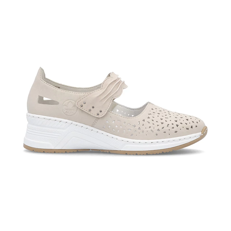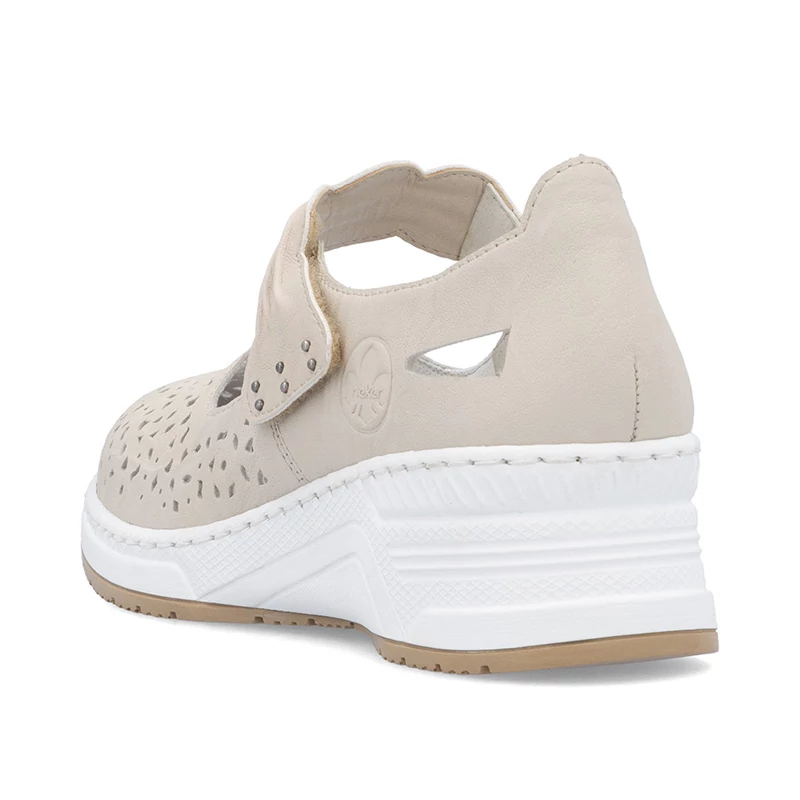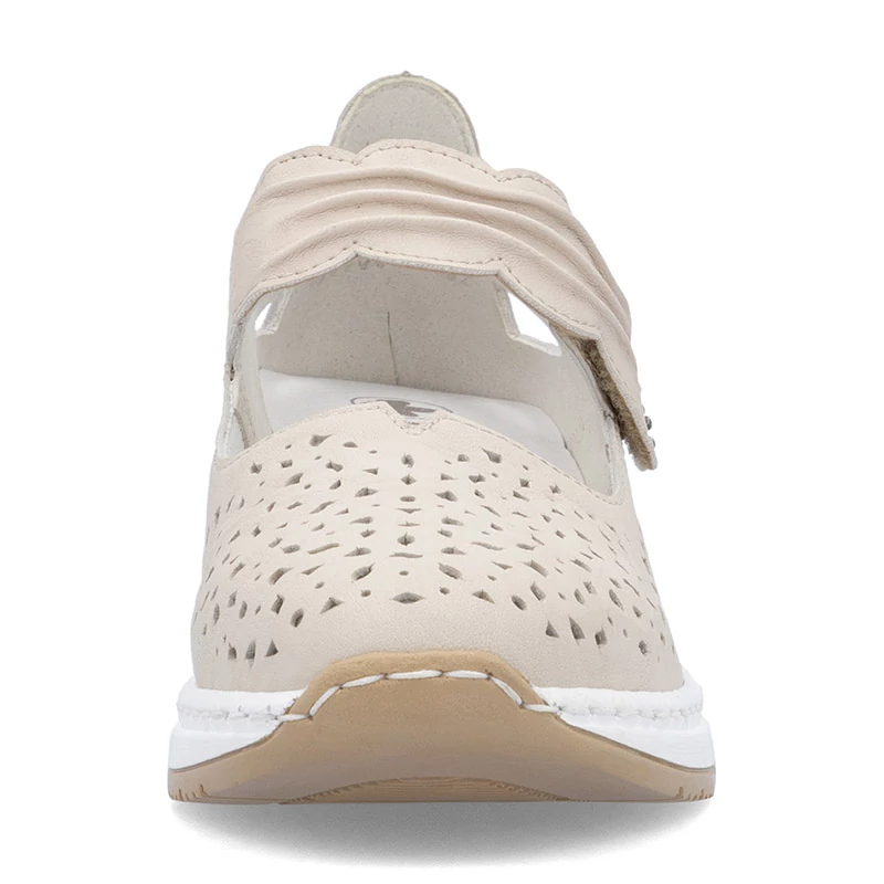A finom perforációval ellátott, könnyű bőr felsőrész légáteresztőt és kellemes érzést biztosít még forró napokon is. Könnyű felvenni és járás közbeni stabilitást a talpon átívelő dekoratívan redőzött pánt biztosítja, amely a tépőzárnak köszönhetően könnyű felhelyezést tesz lehetővé. A könnyű, magasított talp kényelmet biztosít járás közben, míg a kivehető bőrbetét a maximális kényelemhez járul hoz Sebastiano cipő webáruház Rieker lábbeli