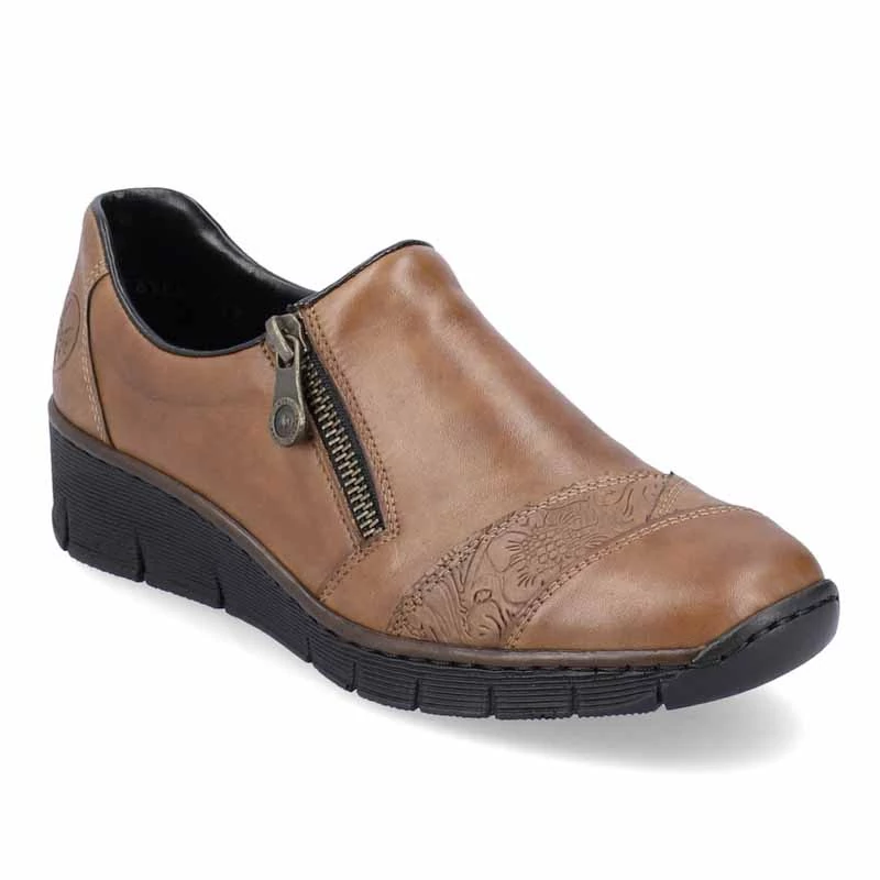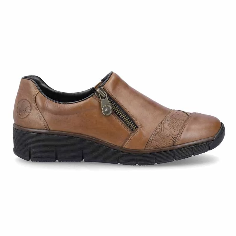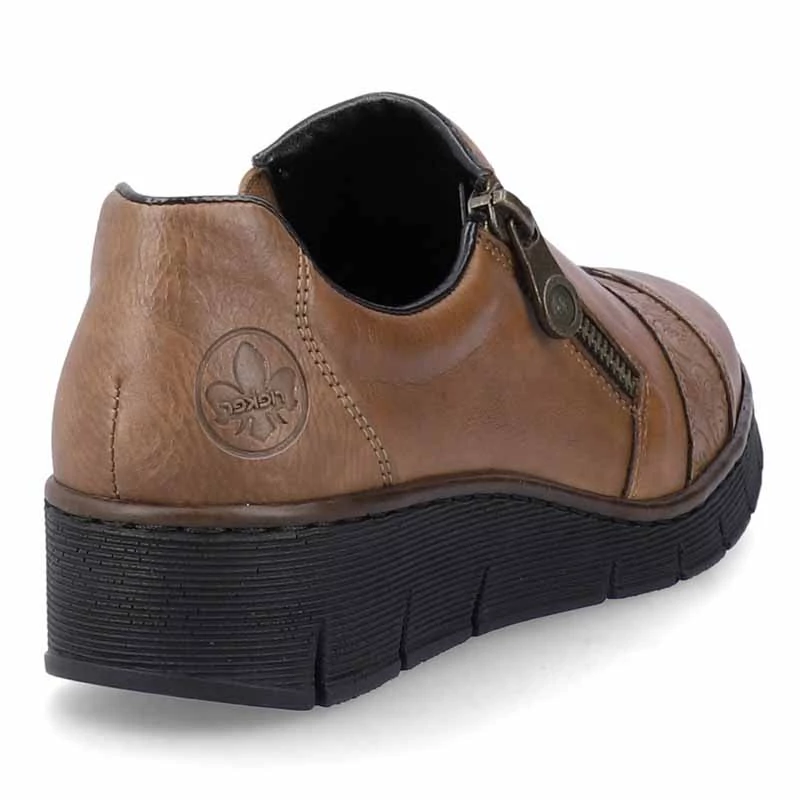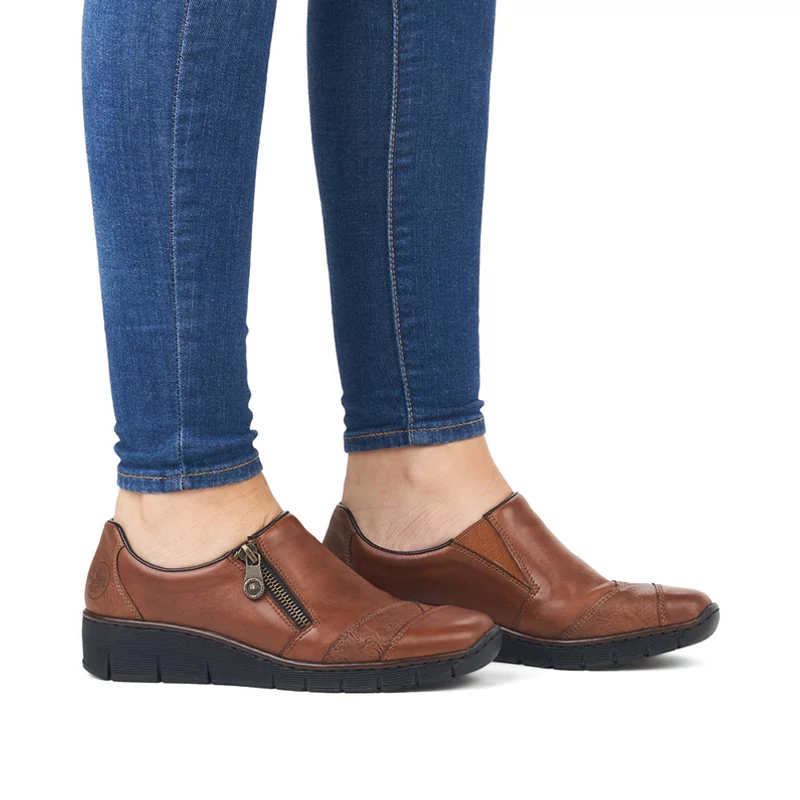 A minőségi felsőrész sima bőrből készült, melyet nyomott minta és cipzár díszít, ami megkönnyíti a felvételt. A kényelmes talpbetét is kiváló minőségű bőrből készült, amely jól megérdemelt kényelmet biztosít.Antistressz - ennek a technológiának köszönhetően a talp könnyű, rugalmas, rálépéskor elnyeli az ütéseket és könnyen alkalmazkodik minden lábfejhez. Sebastiano cipő webáruház Rieker lábbeli