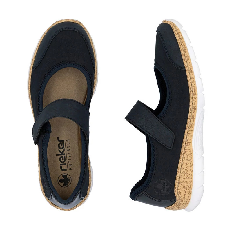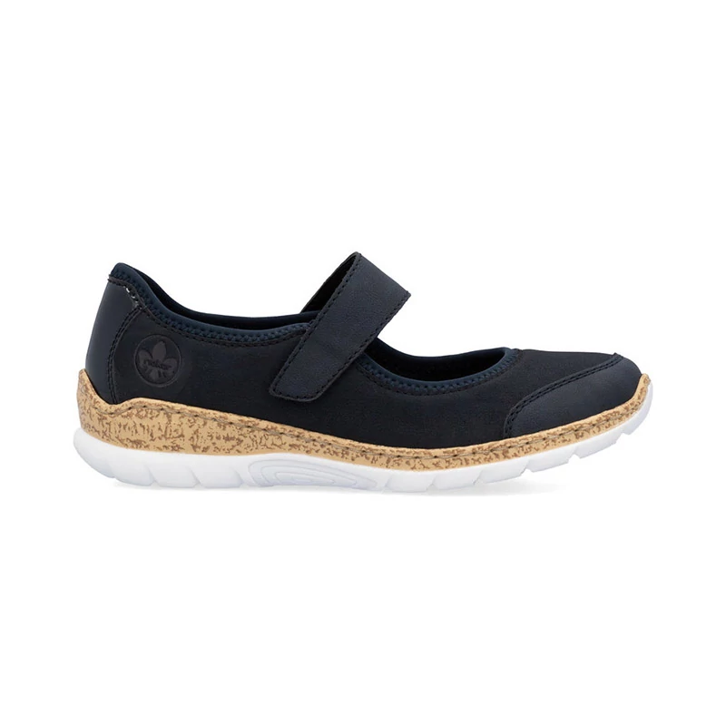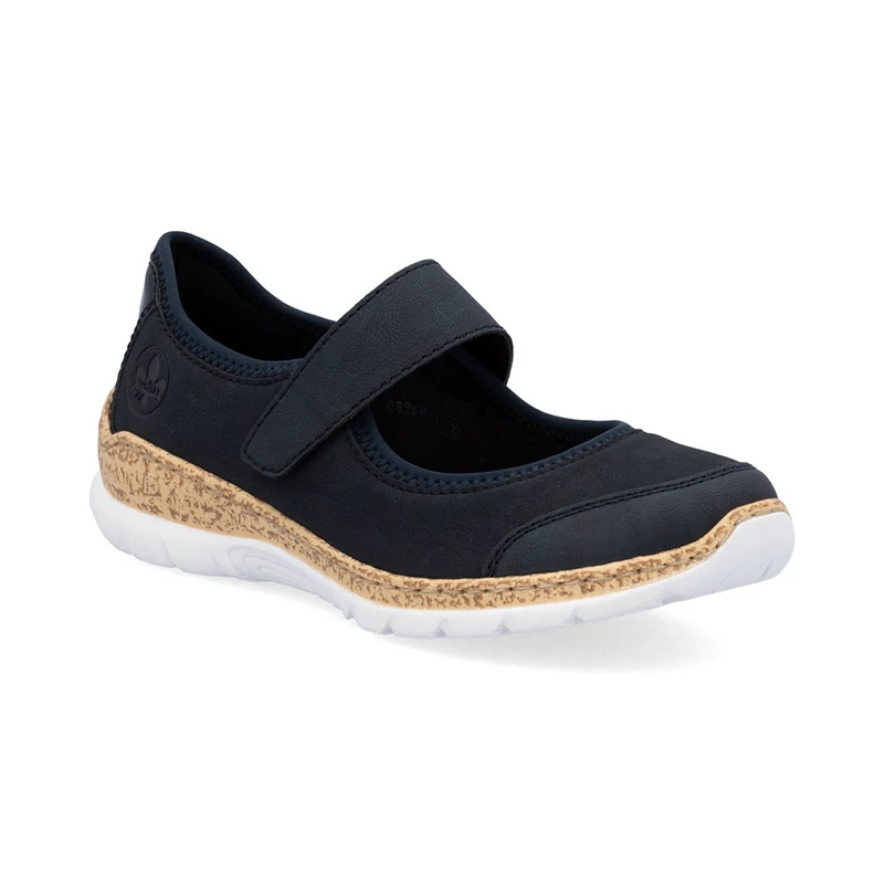 A sötétkék felsőrész elegánsan díszített egy fényes sarokkal és a márka logóval, amely stílusos megjelenést kölcsönöz a cipőnek. A pánt tépőzárral van ellátva, amely lehetővé teszi a könnyű felhelyezést és az Ön igényeinek megfelelő beállítást. A talpbetét puhaságával kényelmes érzést biztosít, a talp érdekes megjelenésű és hatékonyan nyeli el a járás közbeni ütéseket. Sebastiano cipő webáruház Rieker lábbeli