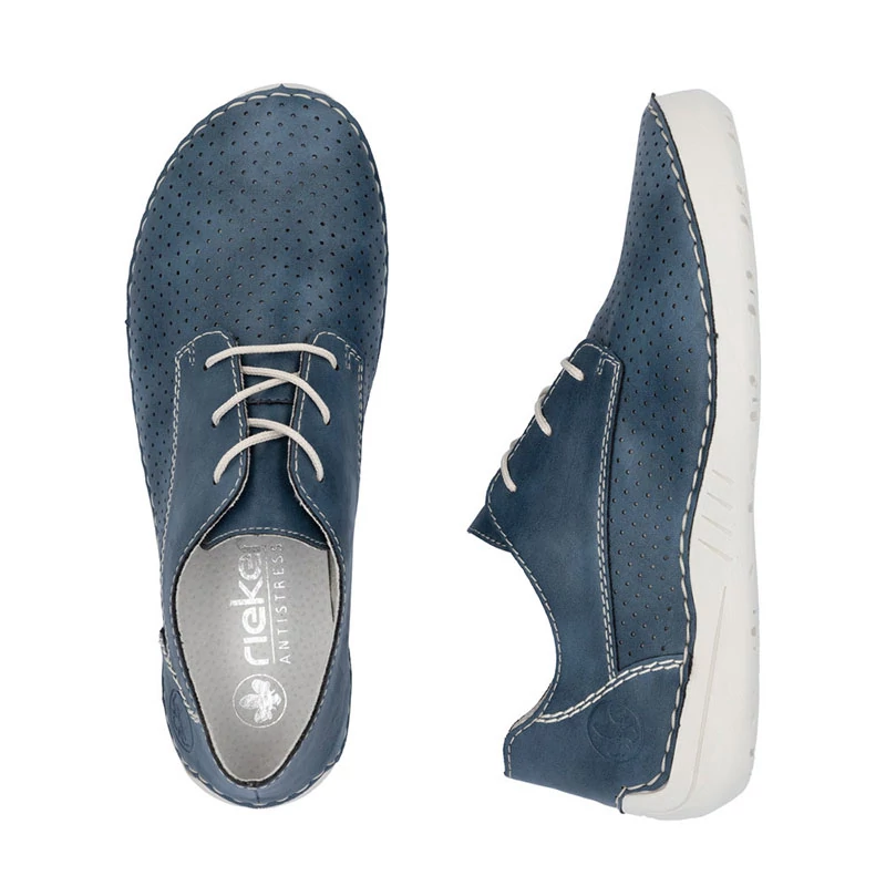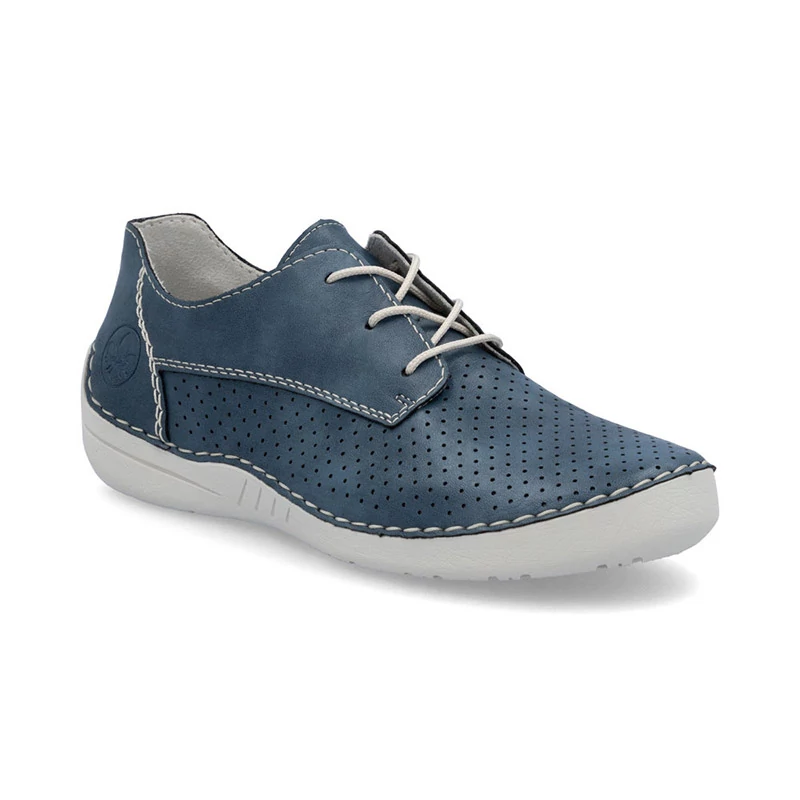 Ezek a RIEKER női cipők minden nőnek megfelelnek. A kék felsőrész finom perforációval, kontrasztos varrással és a sarkán nyomott márkalogóval díszített. A puha bőr talpbetét maximális kényelmet biztosít, a talp pedig Antistress technológiával készült, így könnyű és rugalmas. A cipő ideális választás egy városi sétához vagy egy baráti kávézáshoz. Sebastiano cipő webáruház Rieker lábbeli