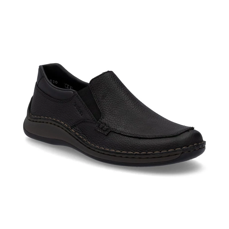 A Rieker fekete bőrcipő egyszerű megjelenésének köszönhetően könnyen kombinálható. A lábfejen lévő bevarrt gumiszalagok megkönnyítik a felhelyezést, ahol finom dekoratív varrások is vannak, és a nyomtatott márkanévvel tökéletes egységet alkot. A puha bőr talpbetét minden lépését elkíséri, és ideális választás szélesebb lábfejű férfiak számára. A rugalmas talppal együtt ideális cipő lesz munkához és szabadidős tevékenységekhez. Antistressz - négy antistressz tulajdonságának köszönhetően - könnyedség, rugalmasság, tágasság és kiváló lengéscsillapítás - a RIEKER cipők kényelmesebb sétát kínálnak. Extra Wide – az ezzel a jelöléssel ellátott cipők széles lábra tervezett talpbetéttel rendelkeznek. Sebastiano cipő webáruház Rieker lábbeli
