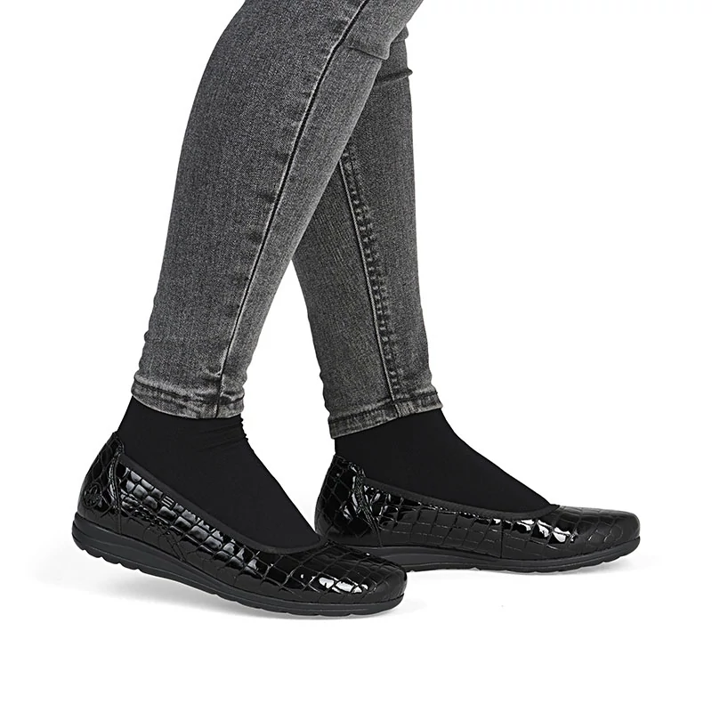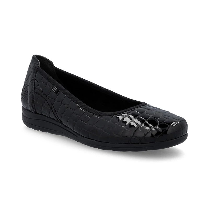 Ezeknek a RIEKER balerináknak a lenyűgöző megjelenése tagadhatatlan - a fekete felsőrész fényes felülete, a mintavonalak és a diszkrét márkalogó elegáns benyomást kelt. A kellemes bőr talpbetét minden lépésnél kényelmet biztosít, míg a rugalmas, ütéscsillapító technológiával ellátott talp egész napos kényelmes járást garantál. Ideális azoknak a nőknek, akik stílusos és kényelmes cipőt keresnek a mindennapokra.Stresszoldó - négy stresszoldó tulajdonságának - könnyedség, rugalmasság, tágasság és kiváló ütéscsillapítás - köszönhetően a RIEKER cipők kényelmesebb járást kínálnak. Sebastiano cipő webáruház Rieker lábbeli