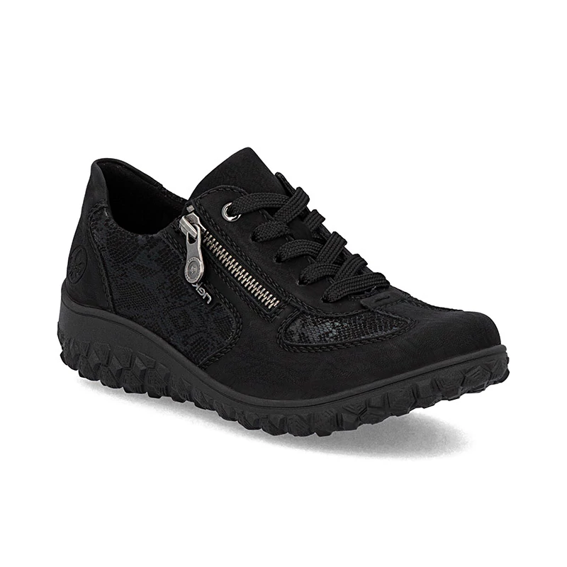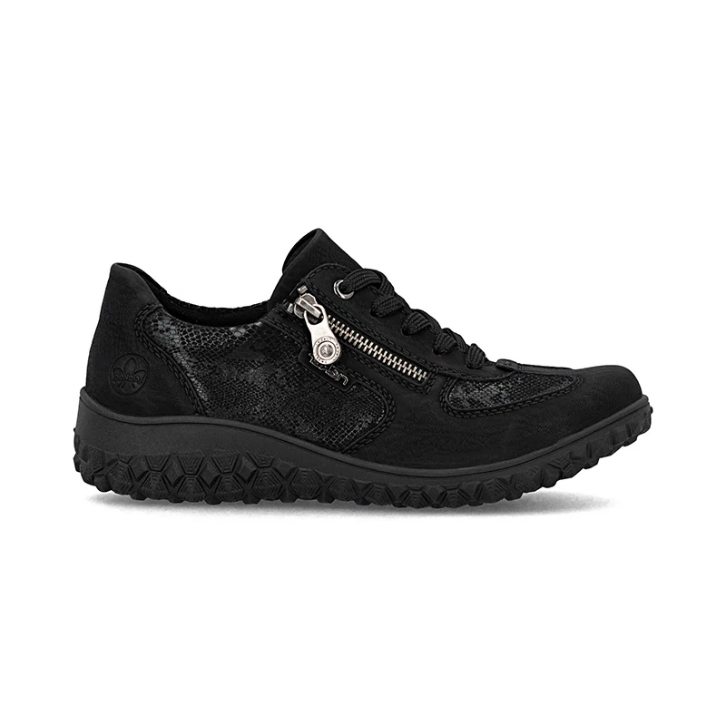 Ezek a RIEKER cipők a divat és a praktikum tökéletes ötvözetét alkotják. A különböző anyagok kombinációjából készült felsőrész, amelyet egy érdekes motívum élénkít, divatos megjelenést kölcsönöz a modellnek, amelyet az ikonikus márkalogó egészít ki. A lábfej belsejében található funkcionális cipzár megkönnyíti a felvételt, míg a fűző lehetővé teszi a cipő egyéni beállítását. A szélesebb lábfejhez illő puha, kivehető talpbetét és a könnyű, rugalmas talp egész napos kényelmet biztosít. Ideális cipő azoknak a nőknek, akik ki szeretnének tűnni a tömegből anélkül, hogy a kényelem rovására mennének. Sebastiano cipő webáruház Rieker lábbeli