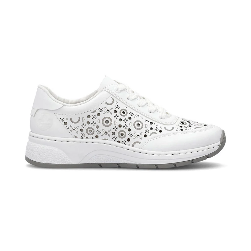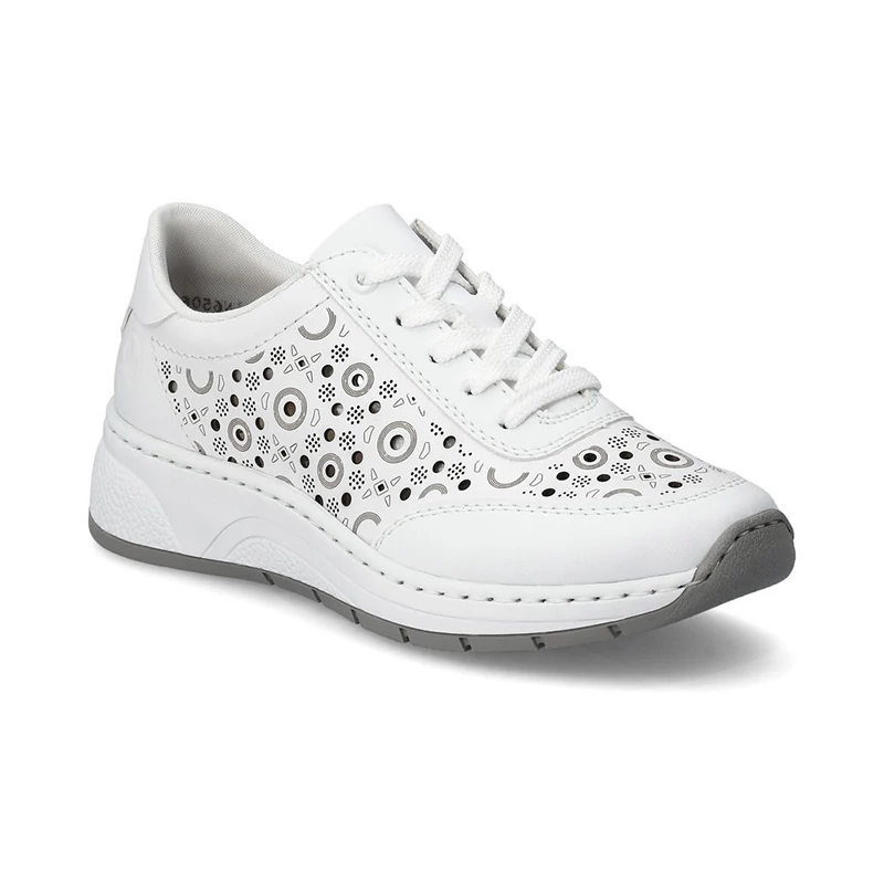 Fedezze fel a stílus és a kényelem tökéletes kombinációját a fehér RIEKER tornacipőkkel. A cipők felsőrésze elegáns perforációval és egyedi megjelenést kölcsönző dizájner mintával rendelkezik. A fűzés lehetővé teszi az egyéni beállítást az optimális kényelem és támogatás érdekében. A rugalmas talp könnyű és kényelmes lépésről gondoskodik, míg a puha talpbetét extra kényelmet biztosít Sebastiano cipő webáruház Rieker lábbeli