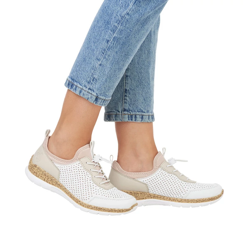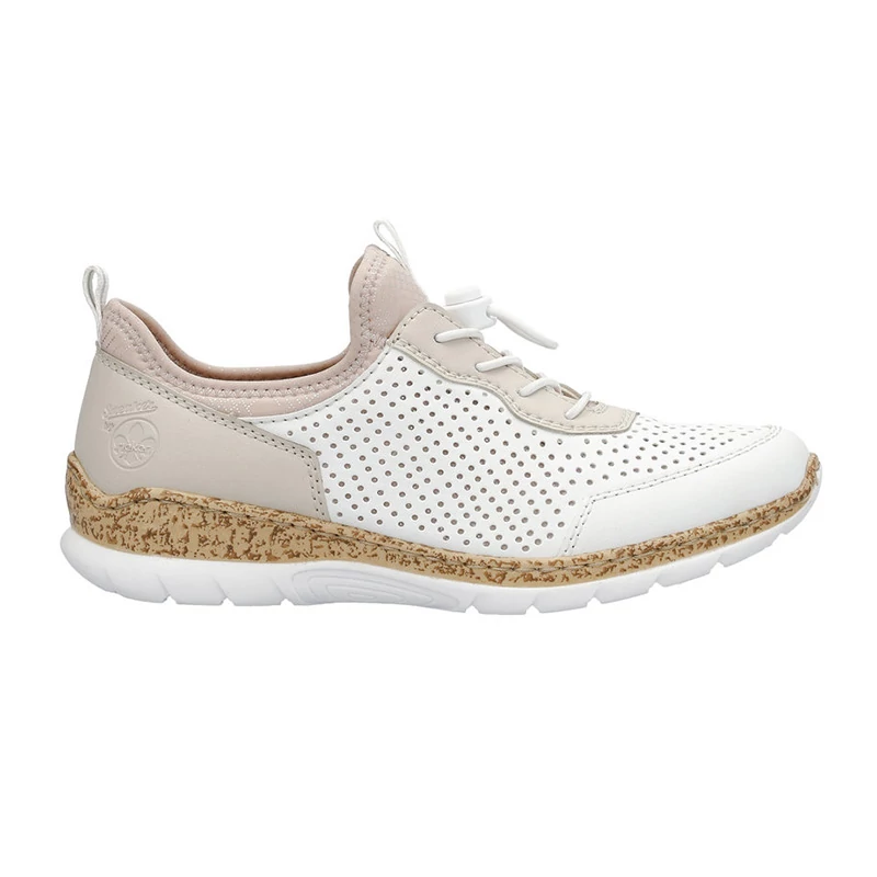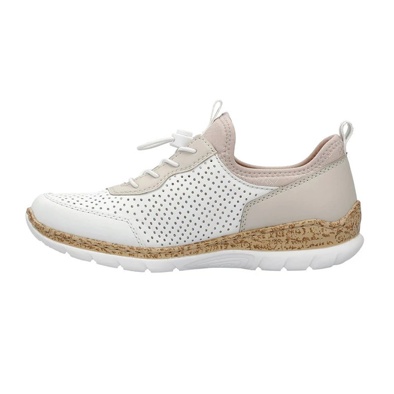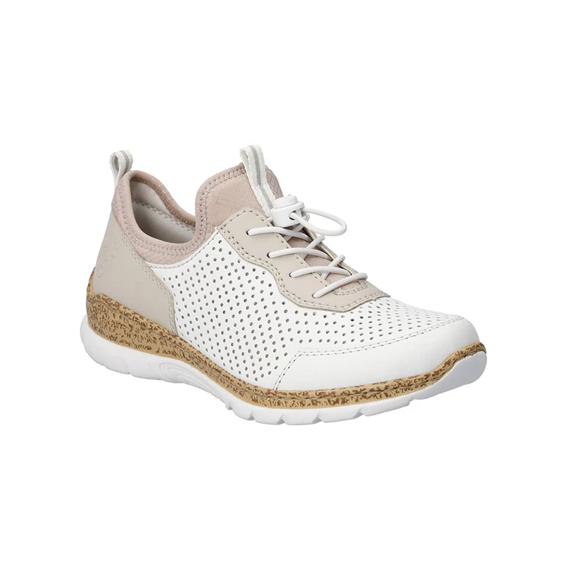 A finoman perforált felsőrész bézs és rózsaszín elemekkel egészül ki. A cipő könnyű felhúzásáról a felső szélének rugalmas bélése, a hurok és a rugalmas gumis fűzés gondoskodik, mely könnyen összehúzható vagy lazítható Sebastiano cipő webáruház Rieker lábbeli