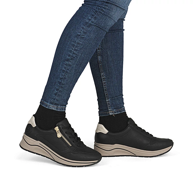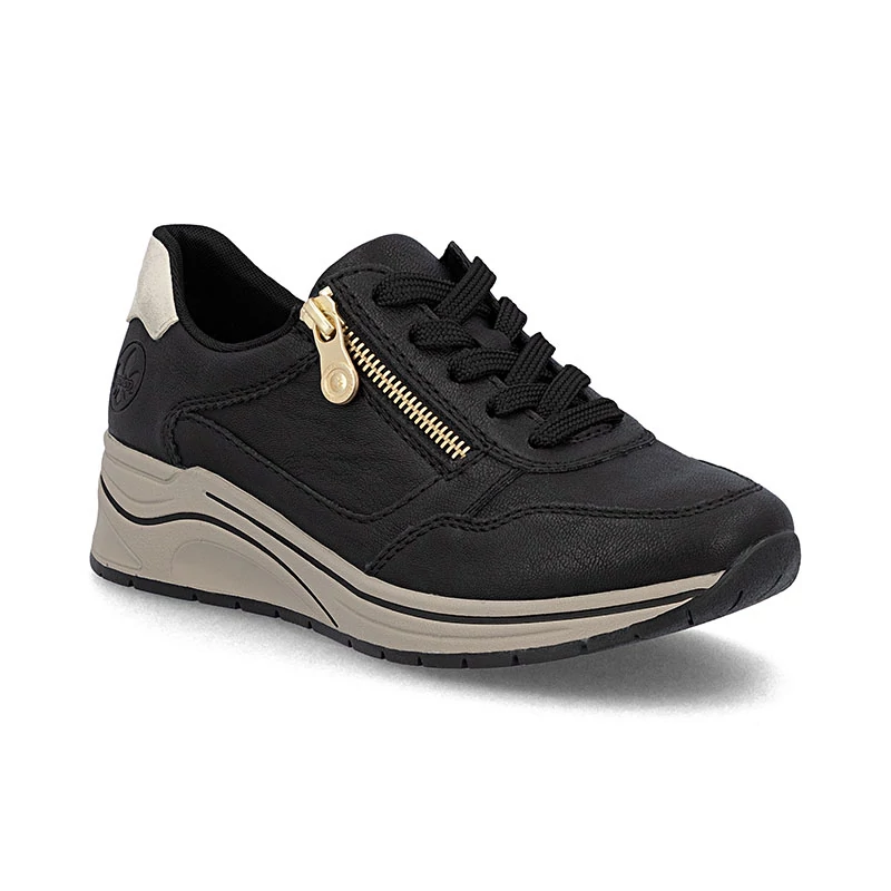Egyedi stílusú és maximális kényelmet kínáló RIEKER cipők, amelyek minden lépésnél nagyszerű élményt nyújtanak. A fekete felsőrészt arany díszítések egészítik ki, divatos kontrasztot teremtve. Az átgondolt tervezésnek és a kiváló minőségű anyagoknak köszönhetően ideális választássá válnak a mindennapi viselethez. A lábfej-fűzővel és cipzárral ezek a cipők nemcsak jellegzetes vizuális benyomást keltenek, hanem praktikus felvételi módot is biztosítanak. A maximális kényelmet a puha, kivehető talpbetét biztosítja, amely minden lépésnél tartást biztosít. A cipő talpa hatékonyan elnyeli az ütéseket járás közben, és kifinomult kialakításának köszönhetően stílusos megjelenést is kölcsönöz. Sebastiano cipő webáruház Rieker lábbeli