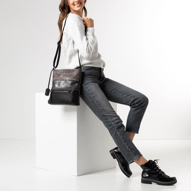 Ha szeretsz eredeti és egyben praktikus lenni, ez a RIEKER kézitáska a megfelelő választás számodra. Az egyszerű szabást a szürke árnyalatok és a fekete szín kombinációja díszíti, az alján egy kis zseb található, amely dekorációs elemként is szolgál. A kézitáska két különálló, cipzárral zárható részre oszlik, melyeket kis zsebekkel egészítenek ki az apróságoknak. A hosszú, állítható hosszúságú pántnak köszönhetően akár egész napos viseletre is praktikus lesz, így az öltözéked kedvenc része lesz. Sebastiano cipő webáruház Rieker lábbeli