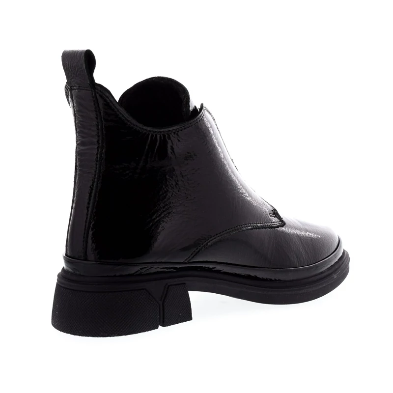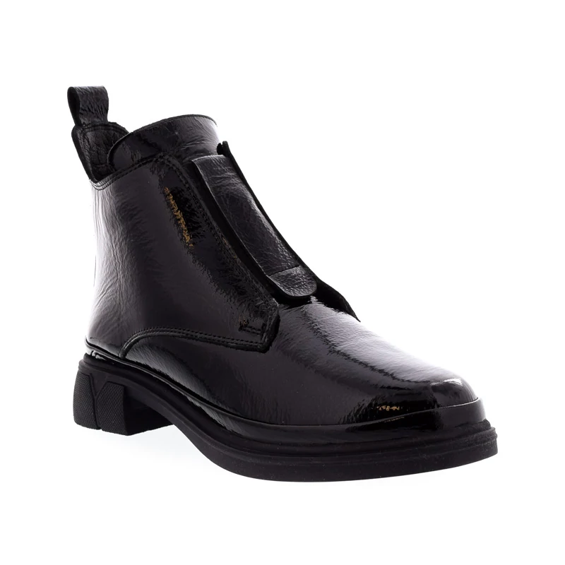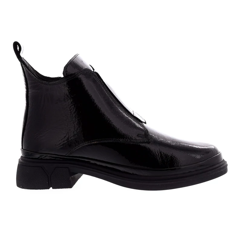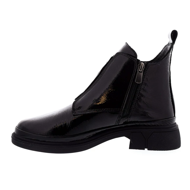 Ez a fekete, lakkbőr bokacipő elegáns, mégis modern megjelenést biztosít. Letisztult vonalvezetését a praktikus cipzáras megoldás teszi teljessé. Vastagabb talpa kényelmes viseletet garantál egész nap, miközben karakteres stílust kölcsönöz. Bélése textilből készült, talpa gumi, sarokmagassága 35 mm. Tökéletes választás városi hétköznapokra vagy egy stílusos őszi-téli szett kiegészítőjeként. Sebastiano cipő webáruház Női cipő