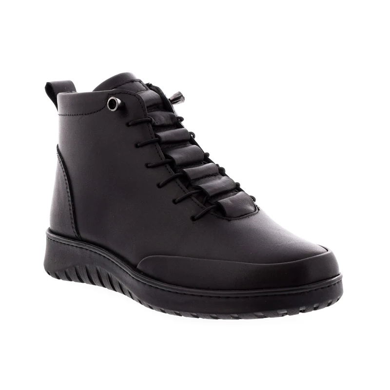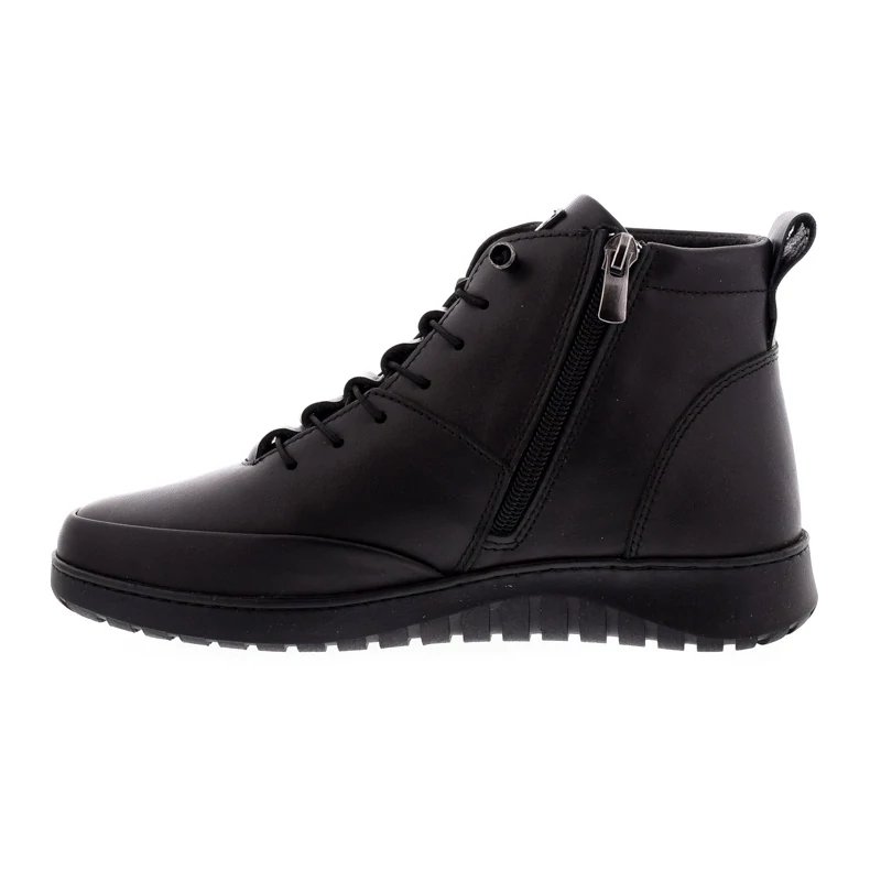 Ez a fekete magasszárú cipő letisztult vonalaival klasszikus alapdarab, mely a minőséget és a komfortot ötvözi. Felsőrésze természetes bőrből készült, bélése bőr és textil kombinációja. A vastagított, gumitalp stabil járást és kényelmet biztosít, paraméterei 30/20 (sarokmagasság/talpmagasság). Ideális választás a mindennapokra. Sebastiano cipő webáruház Női cipő