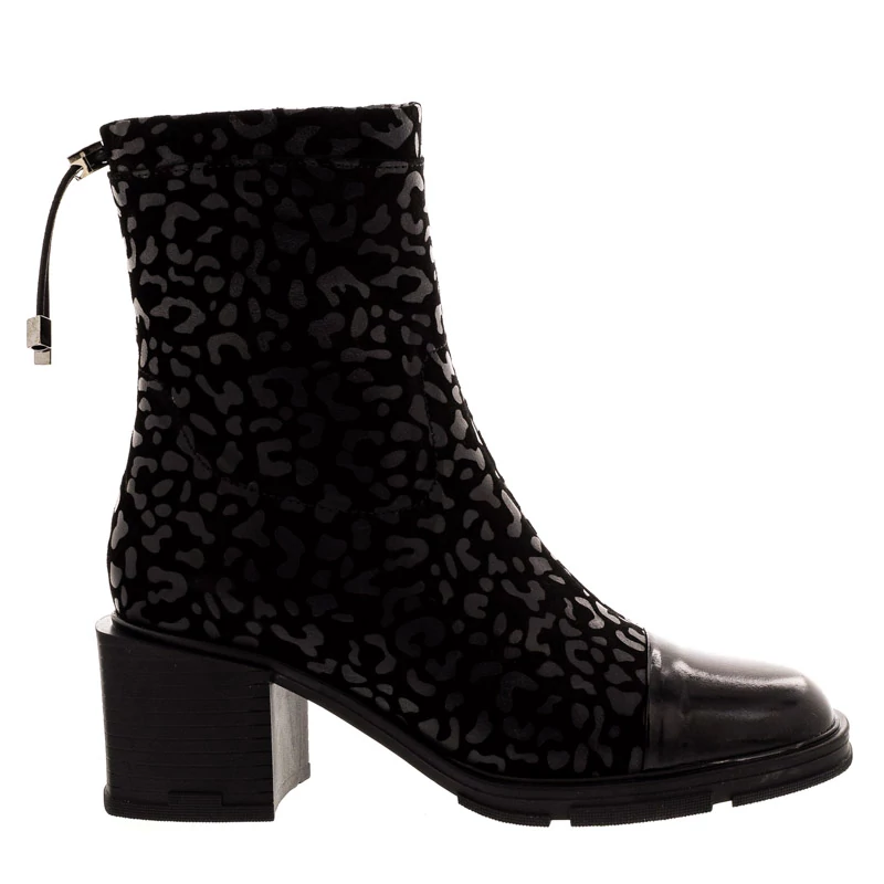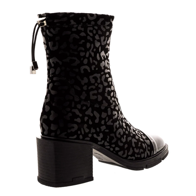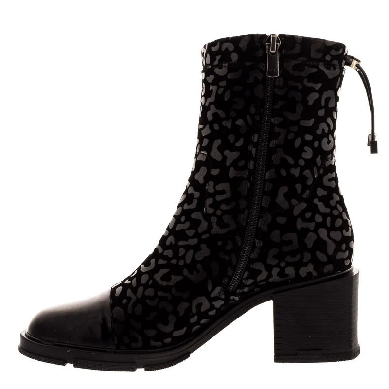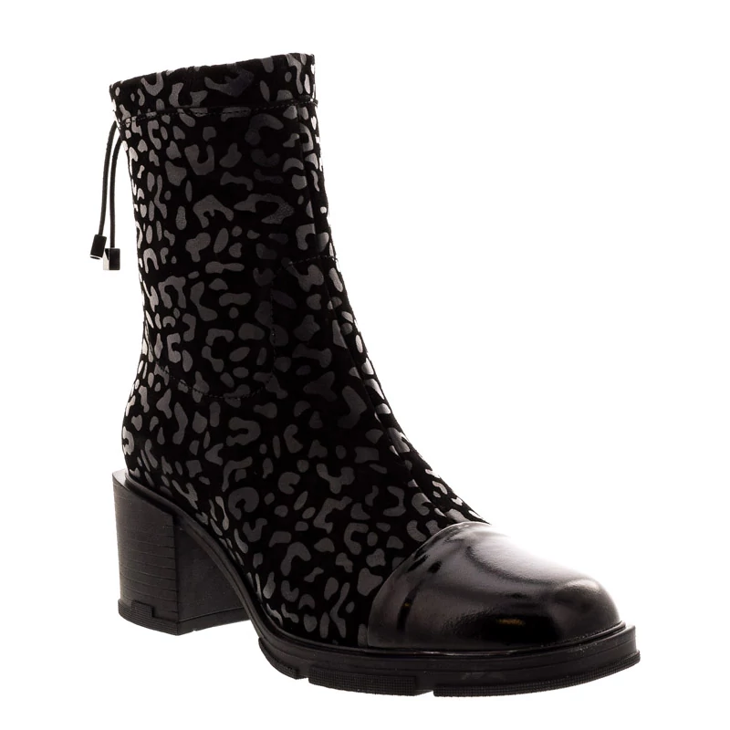 Stílusos Sebastiano bokacsizma. Felsőrésze nyomott mintás velúr bőr, orr részen lakk bőrbetéttel, bélése textil, talpa gumi, melynek paramétere 60/12 mm (sarokmagasság/talpmagasság). Vastagított gumitalpa és blokk sarka magabiztos járást biztosít. Különleges mintázata igazán egyedi megjelenést kölcsönöz, nőies és karakteres kiegészítője bármely öltözéknek. Sebastiano cipő webáruház Női cipő