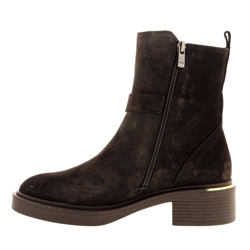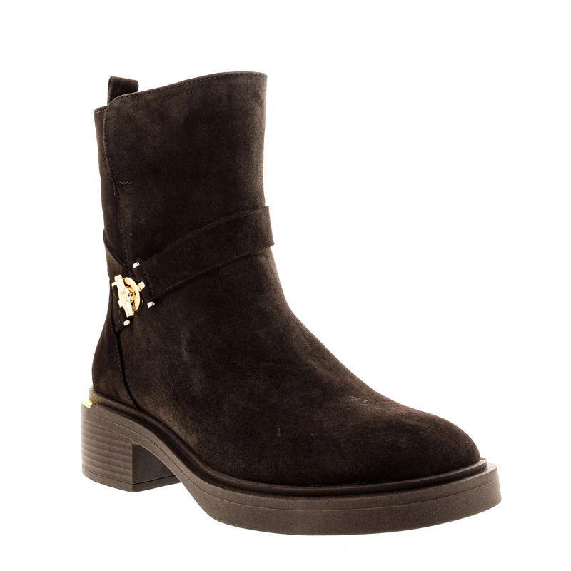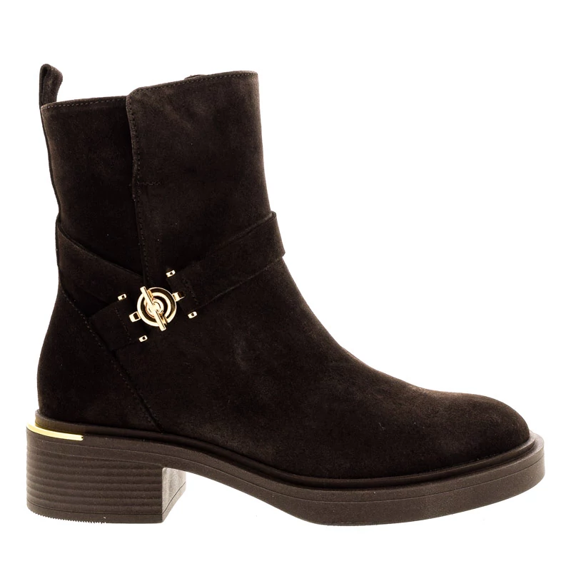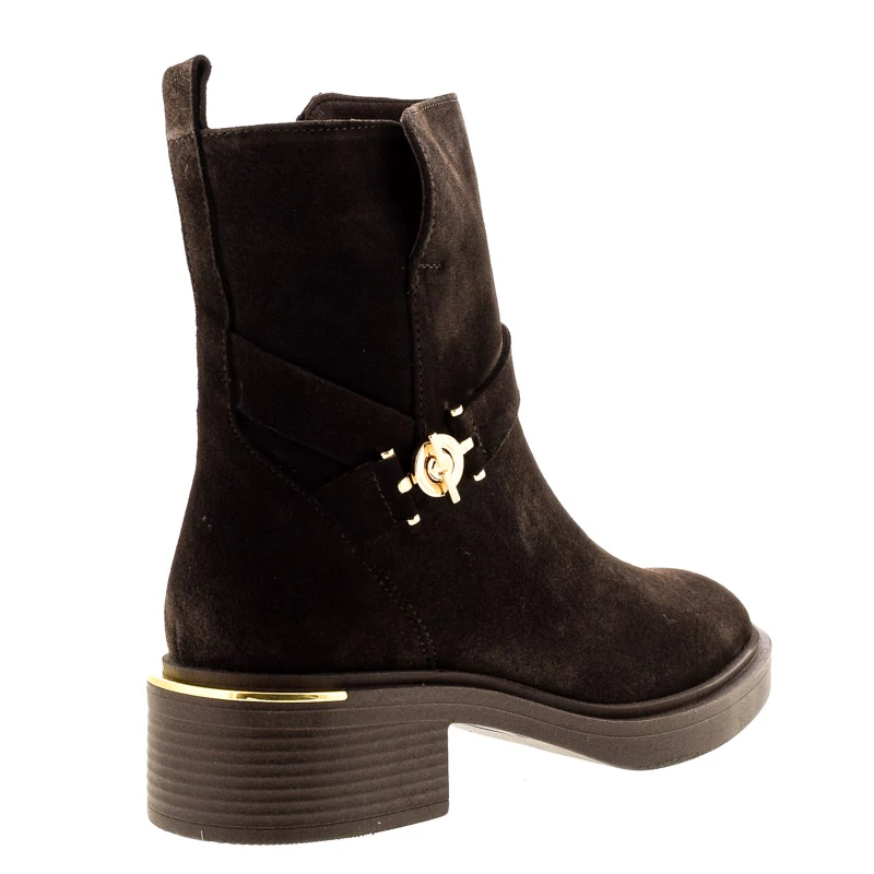 Divatos Sebastiano bokacsizma velúr bőr felsőrésszel. Bélése textil, talpa gumi, melynek paraméterei 50/20 mm (sarokmagasság/talpmagasság). Vastag gumitalpa és puha talpbélése kényelmes viseletet nyújt a mindennapok során. A külső oldalon elhelyezett arany színű csat díszítés stílusos megjelenést kölcsönöz. Sebastiano cipő webáruház Női cipő