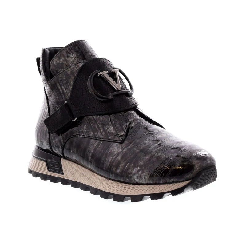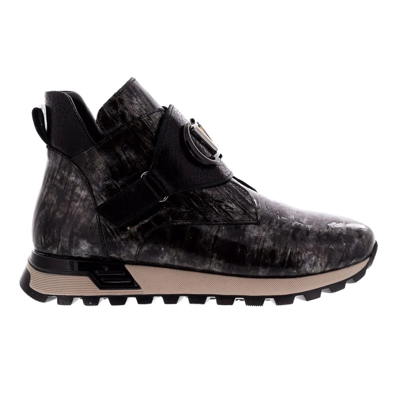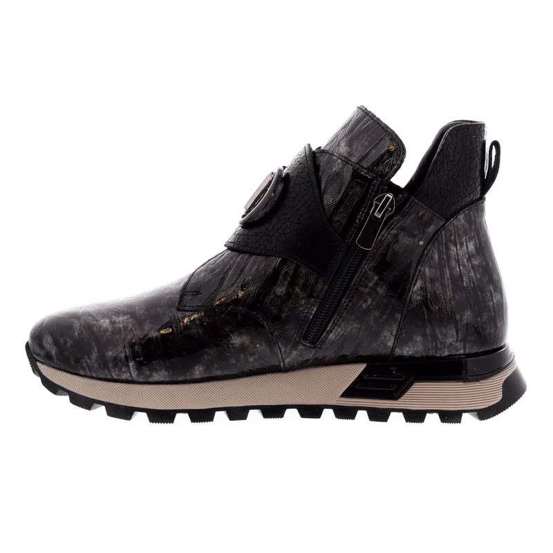 Ez a fényes, lakkbőr bokacsizma mintás textúrájával különleges megjelenést biztosít. A kétoldali cipzár kényelmes használatot tesz lehetővé, míg a dekoratív fémcsat extra stíluselemet visz a cipőbe. Felsőrésze kiváló minőságű lakkbőrből készült. Bélése textil, talpa gumi, paraméterei 30/15 (sarokmagasság/talpmagasság). A könnyű és rugalmas gumitalp kényelmet biztosít a mindennapi rohanásban. Ez a darab tökéletes választás az extravagáns stílus kedvelőinek. Sebastiano cipő webáruház Női cipő