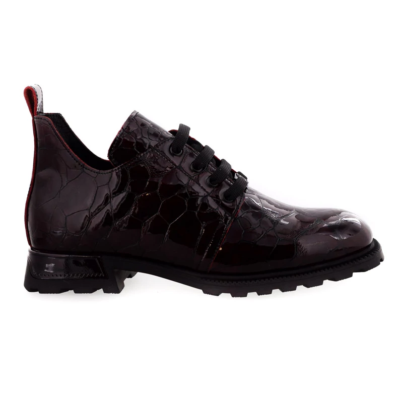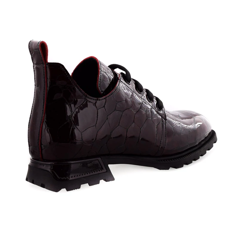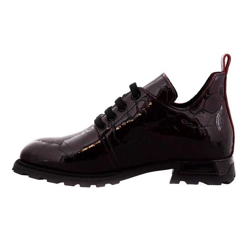 Ez a Sebastiano márkájú fűzős félcipő kifinomult megjelenést kínál, miközben megtartja a mindennapi viselethez szükséges kényelmet. A lakkozott, mélybordó színű, nyomott mintás valódi bőr felsőrész különleges fényt és mélységet ad a cipőnek, míg a klasszikus fűzős kialakítás biztos illeszkedést nyújt. A puha textil bélés egész napos komfortot garantál, a rugalmas gumitalp pedig stabilitást és tartósságot biztosít. Sarokmagassága 30 mm. Ez a modell ideális választás az őszi-téli gardrób frissítéséhez - jól illik szövetnadrághoz, farmerhez vagy egy vastagabb harisnyával viselt ruhához is. Sebastiano cipő webáruház Női cipő