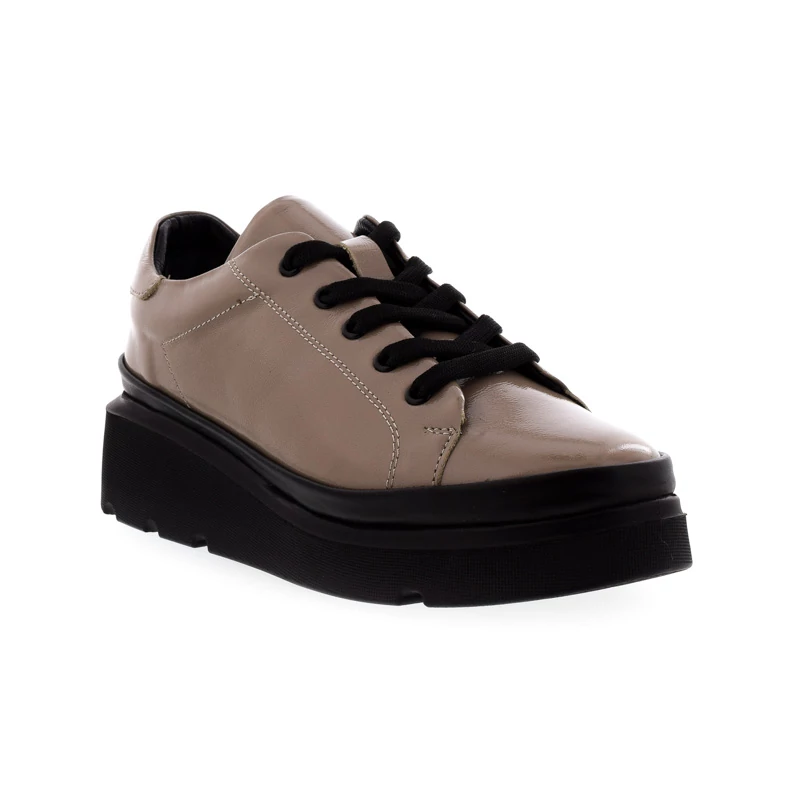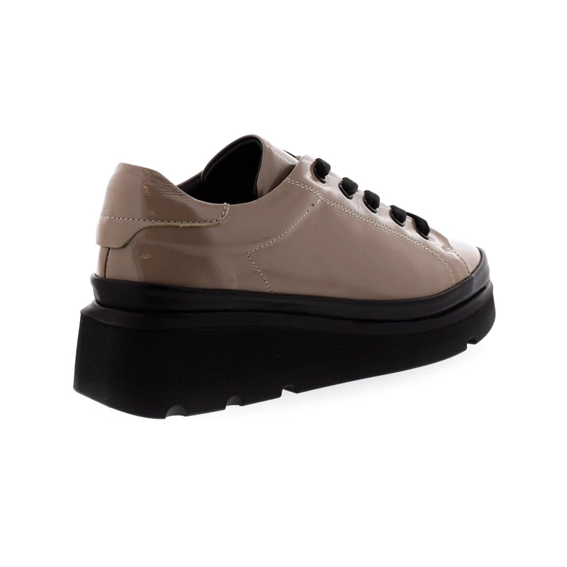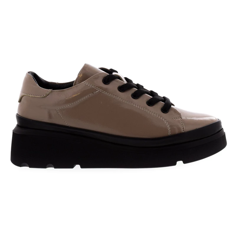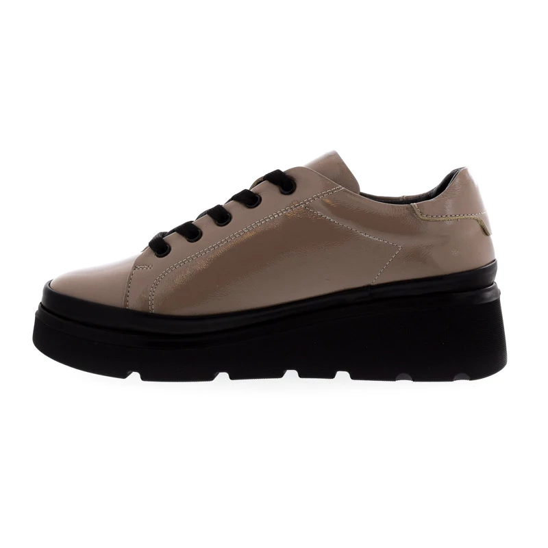 Ez a magas talpú, bézs színű sneaker letisztult formavilágával és lakkozott bőr felsőrészével modern és nőies választás. Felsőrésze lakkbőrből készült, bélése természetes bőr, talpa gumi, melynek paraméterei 40/20 (sarokmagasság/talpmagasság). A fekete fűzők kontrasztos megjelenést biztosítanak, míg a kényelmes kialakítás egész napos viseletre is alkalmassá teszi. Sebastiano cipő webáruház Női cipő