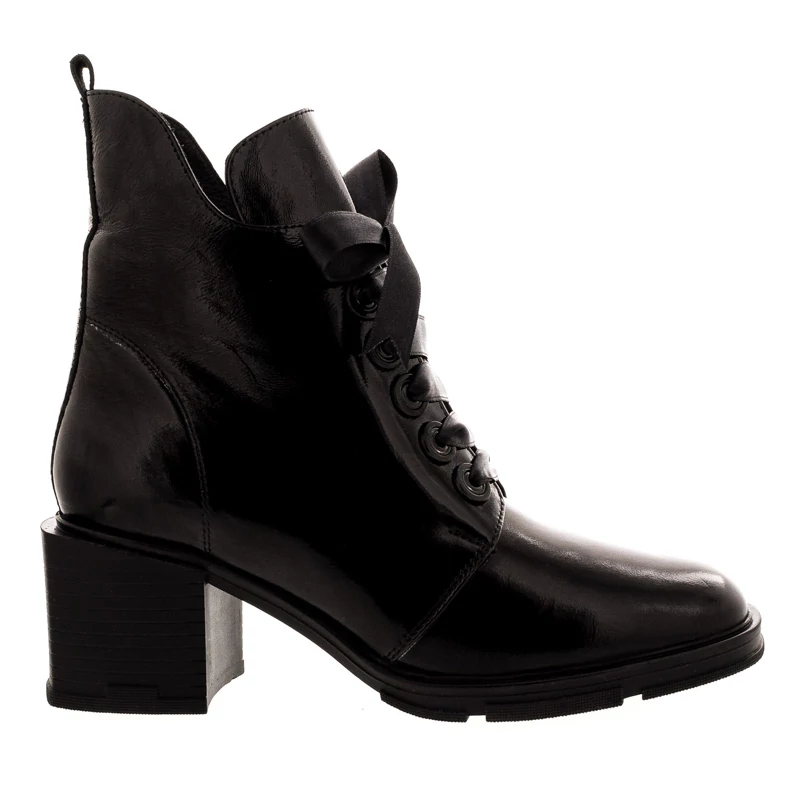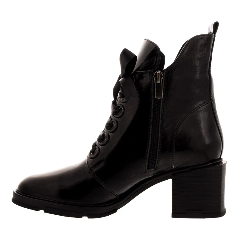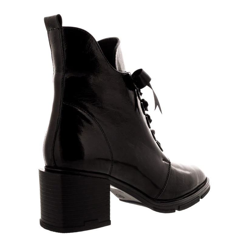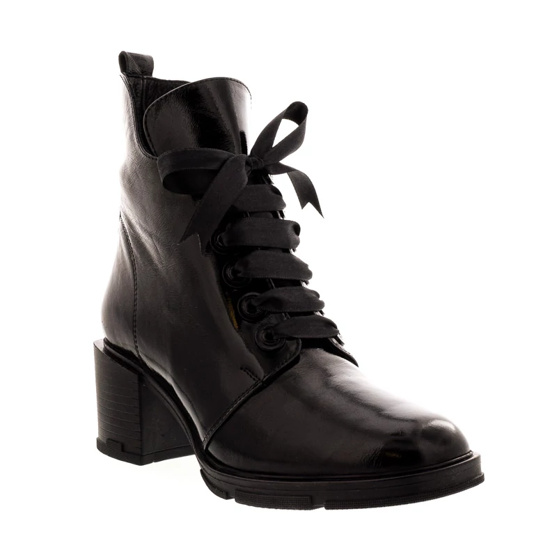 Ez a Sebastiano női fűzős bokacipő elegáns és karakteres választás a hűvösebb napokra. Felsőrésze fényes lakk bőrből készült, bélése textil, talpa gumi, melynek paraméterei 60/12 mm (sarokmagasság/talpmagasság). A vastagított gumitalp stabil járást biztosít, blokk sarka pedig nőies, mégis kényelmes megjelenést ad. Szatén szalagfűzője különleges, romantikus hangulatot kölcsönöz a modellnek, így tökéletes kiegészítője lehet stílusos, nőies szetteknek. Sebastiano cipő webáruház Női cipő