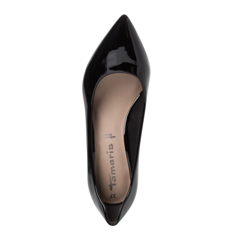 Klasszikus magassarkú női alkalmi cipő. Kényelméről a touch-it technológiával készült puha talpbetét gondoskodik. A cipő sarokmagassága 70mm. Külső része műbőr lakk bevonattal, belső része textil és műbőr. Talpbetét anyaga műbőr. Tökéletes választás lehet különleges alkalmakra, mindennapi használatra nem javasoljuk. Sebastiano cipő webáruház Tamaris